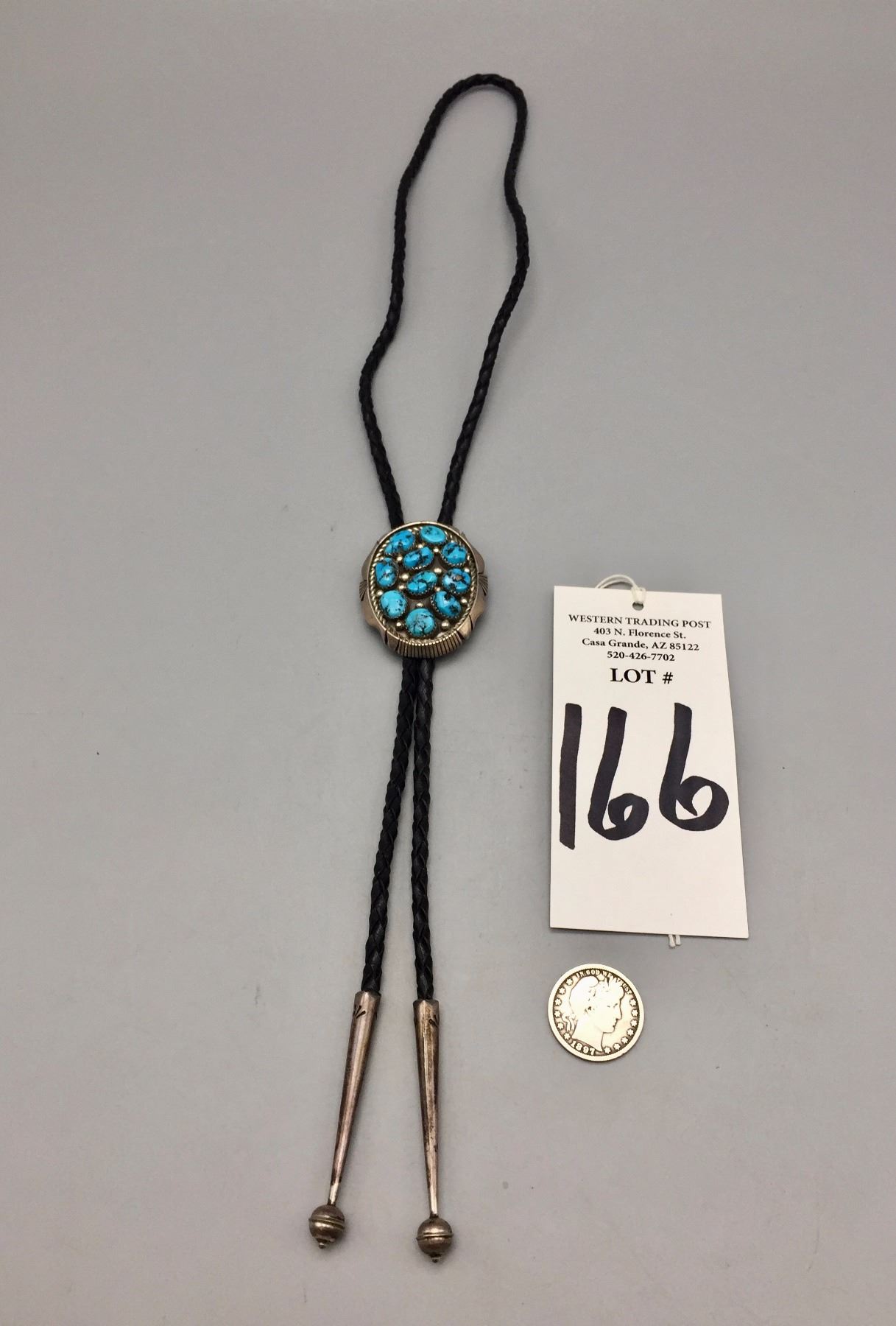 Description: Turquoise and sterling silver bolo with sterling tips.                                                                                         Maker: Hallmarked with an "N". Could be one of several artists.                                                                                                      Approx. Age: Circa 1980s vintage.                                                                                                  Size: Slide 1 3/4"w x 2 1/4"h. Cord 36".                                                                                                                                                                                                               Condition: Good for its age, normal wear expected. Please look closely at the pictures - they are an important part of our description. Shipping: There will be a $5 handling / packaging fee for shipping this lot. The actual cost of postage will be added on top of that.