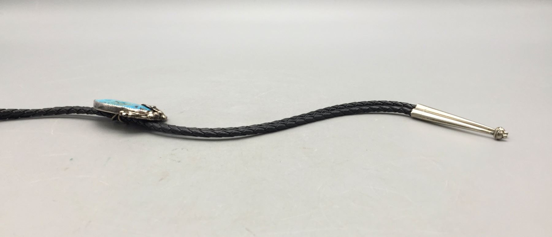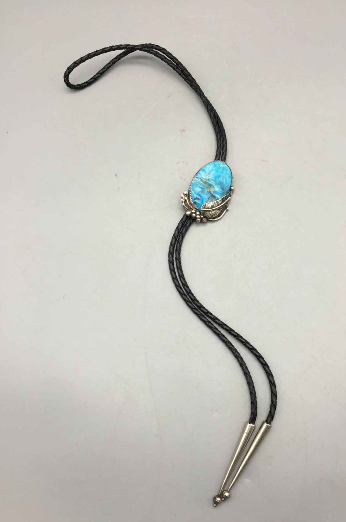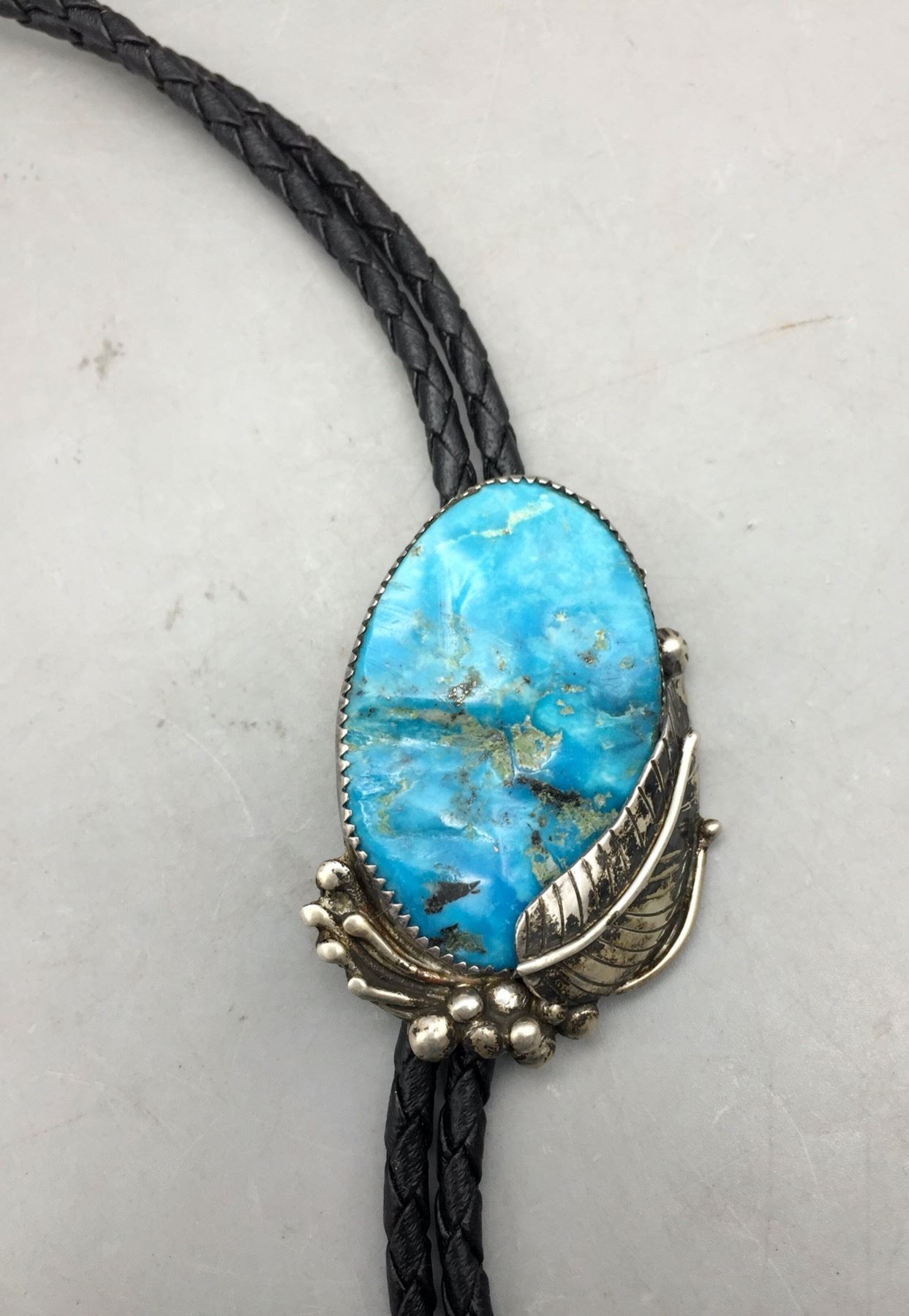 Description: Presented for sale in this lot is a beautiful vintage turquoise and sterling silver bolo tie. It has a nice, blue turquoise stone and sterling silver leaf appliqué and dots accenting it. Maker: Unknown. Approx. Age: Vintage. Size: Cord measures 38†long with tips. Slide measures 3†long X 1-1/2†wide. Weighs 33.4 grams. Condition: Good for its age, normal wear expected. Please look closely at the pictures - they are an important part of our description. Shipping: There will be a $5 handling / packaging fee for shipping this lot. The actual cost of postage will be added on top of that.