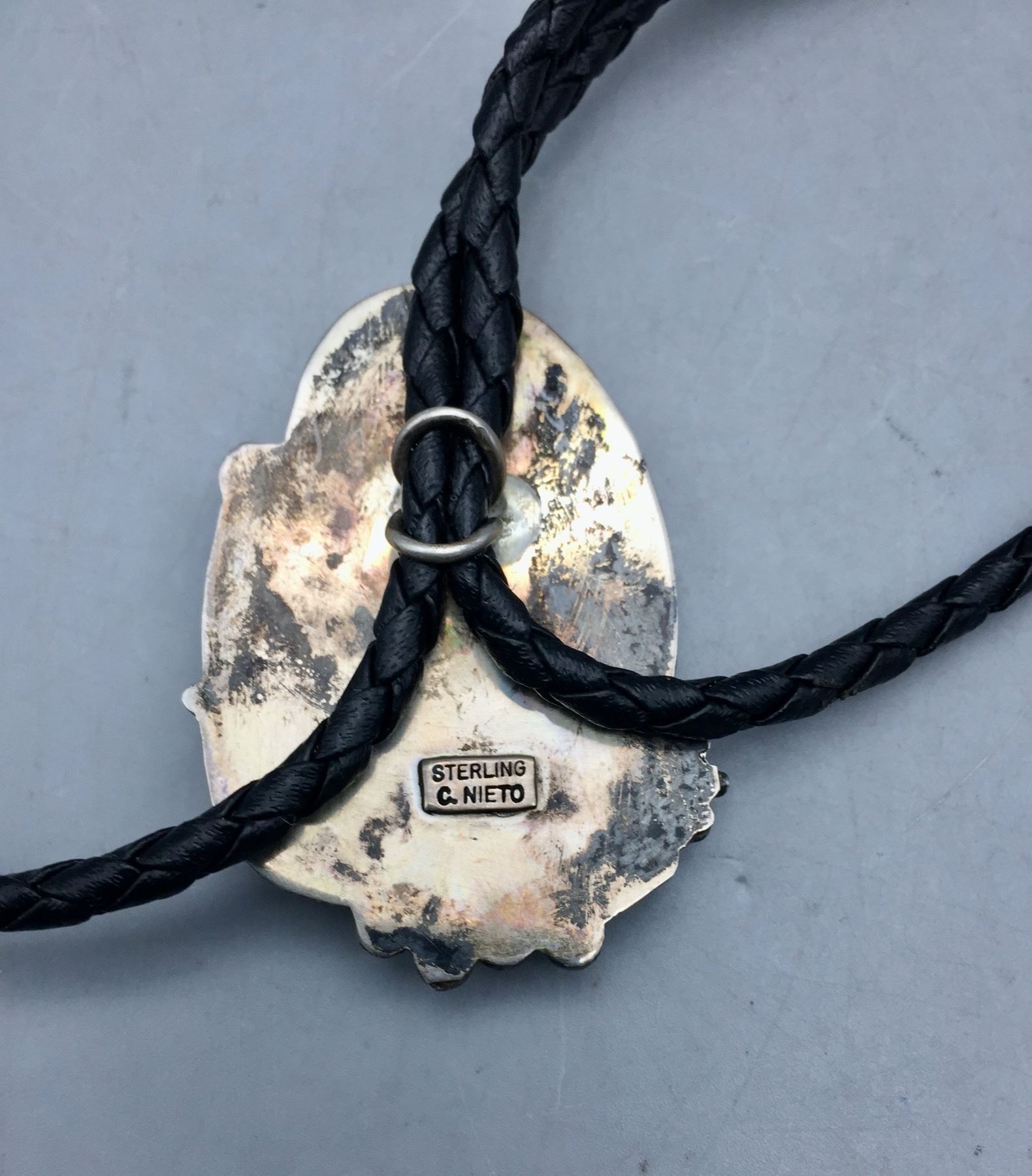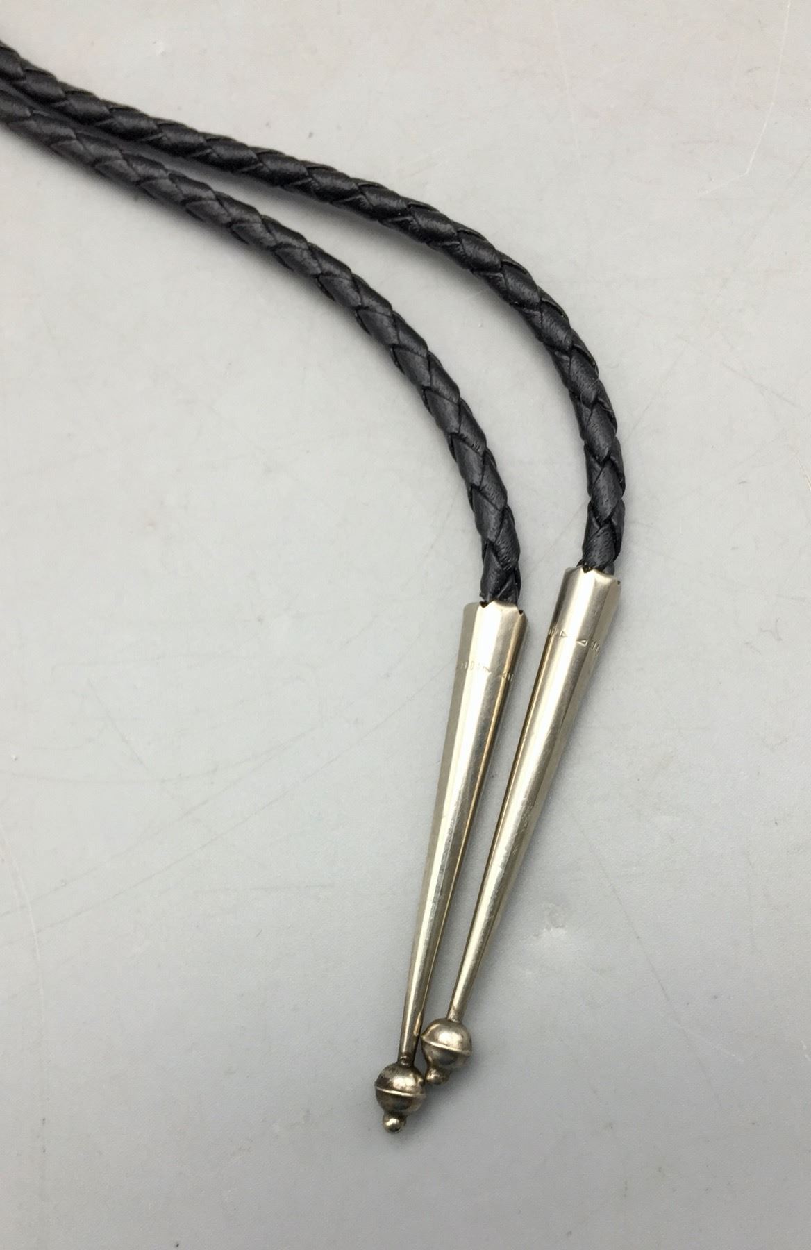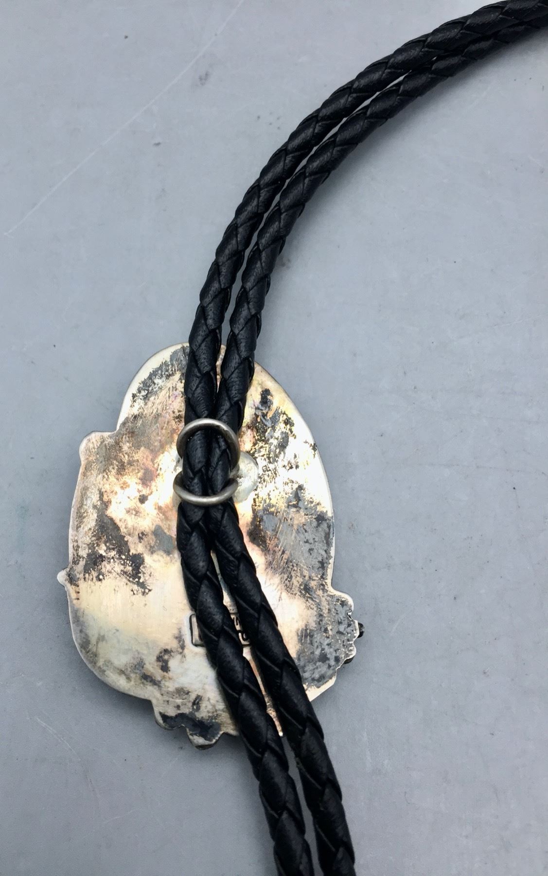 Description: Presented for sale in this lot is a beautiful vintage turquoise and sterling silver bolo tie. It has a nice, blue turquoise stone and sterling silver leaf appliqué and dots accenting it. Maker: Unknown. Approx. Age: Vintage. Size: Cord measures 38†long with tips. Slide measures 3†long X 1-1/2†wide. Weighs 33.4 grams. Condition: Good for its age, normal wear expected. Please look closely at the pictures - they are an important part of our description. Shipping: There will be a $5 handling / packaging fee for shipping this lot. The actual cost of postage will be added on top of that.