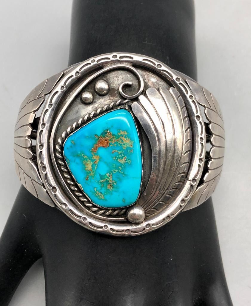 Presented for sale in this lot is a turquoise and sterling silver bracelet from the Carl Luthey Shop. This is an exceptional bracelet set with a nice turquoise cabochon which is accented with silver wire, dots and hand stamped designs. It has heavy gauge wire for the cuff and plates on the side, setting off the design of the piece. It is made from sterling silver. MAKER: The Navajo Hogan. Owned and operated by Carl W. Luthey. (1902-1975: Navajo). It was in operation from 1956 to the early 1970s. APPROX AGE: Circa 1960s. SIZE: Inside circumference measures 5-3/4 inches long. Opening is an additional 1-1/8 inch, fitting a 6-7/8 inch wrist. Width is 2-1/8 inches. Weighs 96 grams. CONDITION: Good for its age, normal wear expected. Please look closely at the pictures as they are an important part of our description and are hereby incorporated into the description, specifically with regards to condition. SHIPPING: There will be a $5 handling / packaging fee for shipping this lot. The actual cost of postage will be added on top of that. BUY IT NOW: If you would like to buy this item now, without waiting for the auction day to bid on it, we do offer this option (which is available up to 48 hours before the actual auction starts). The “Buy it Now†price is the high estimate of this lot (plus applicable fees and the Buyer's premium is discounted to 10% when using the Buy it Now option). If you would like to exercise this option, you must contact us by email (or phone as long as you talk to someone live). Reference this lot number and your intention to "Buy it Now."