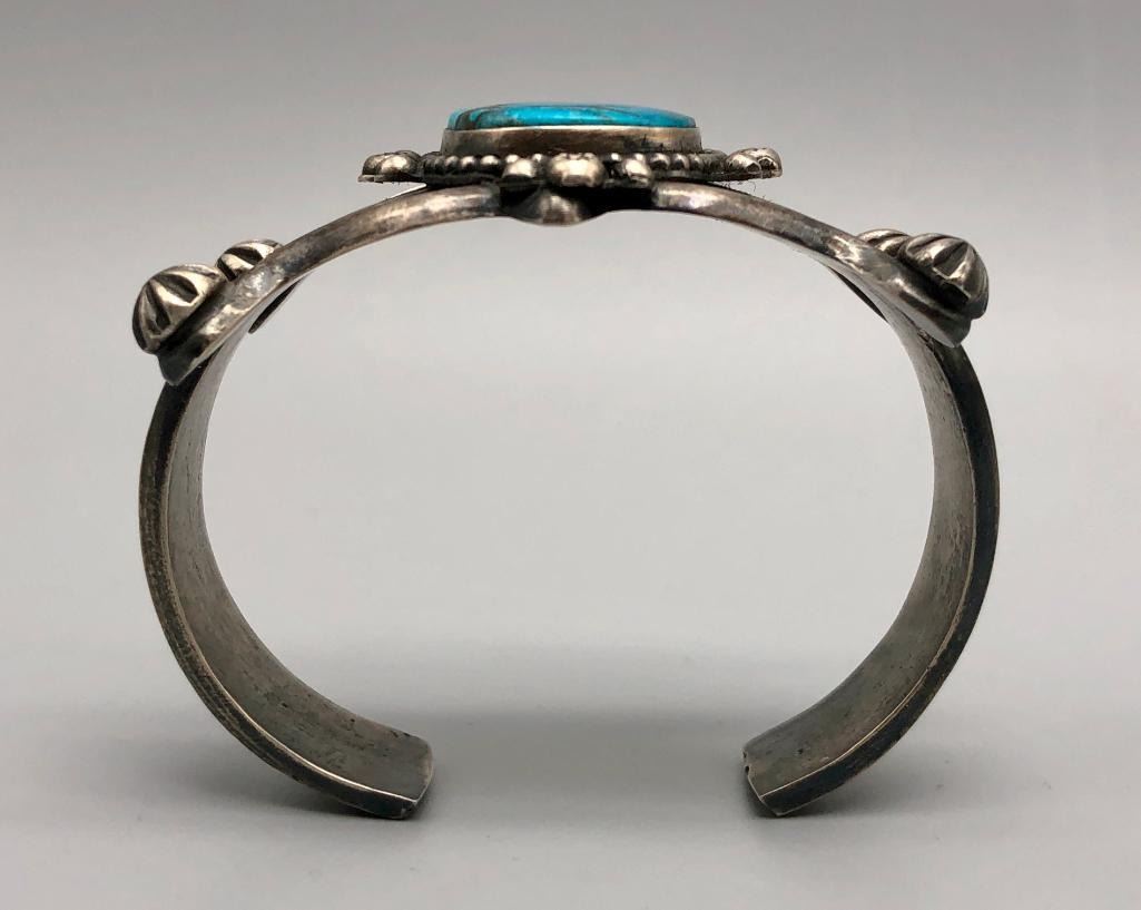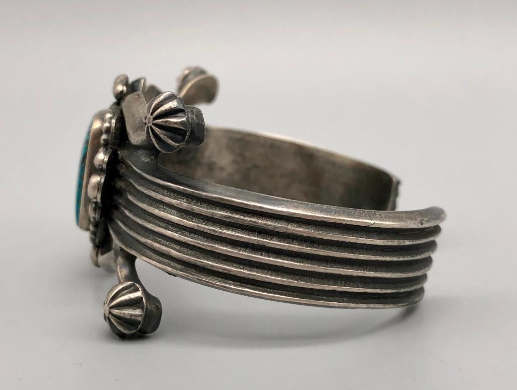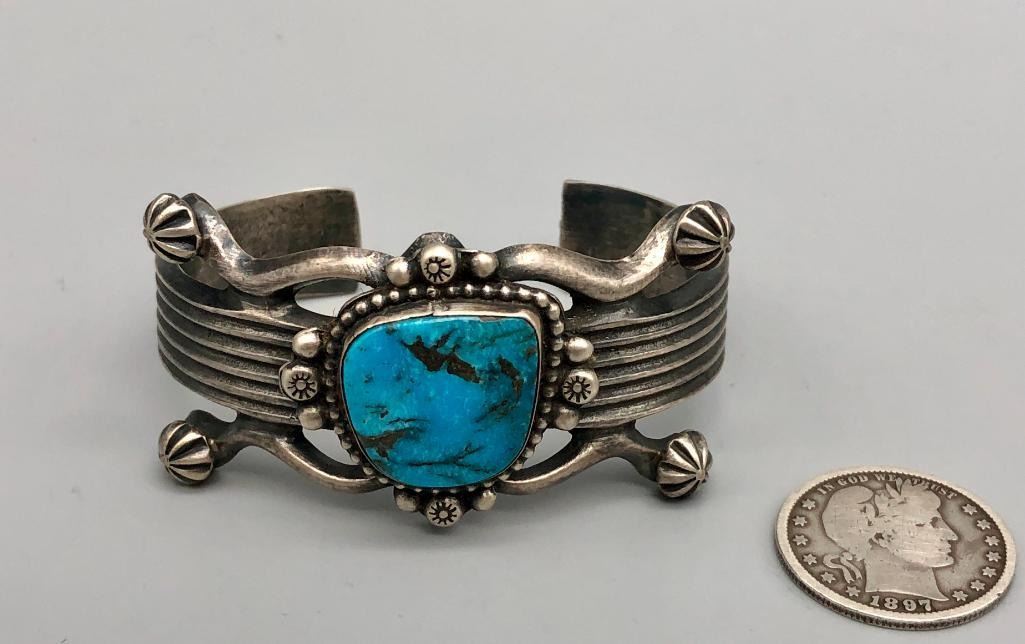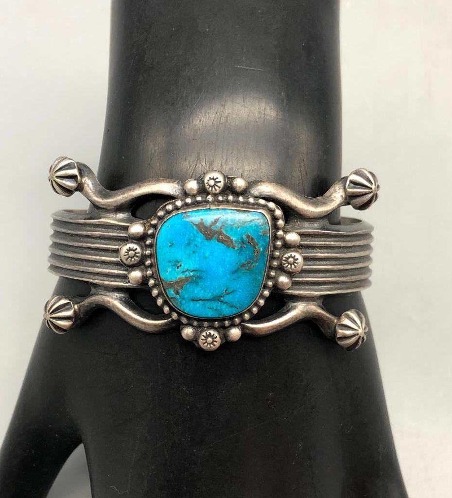 For sale in this lot is a turquoise and sterling silver bracelet. This is a awesome, retro style bracelet set with a beautiful turquoise cabochon. It has great groove work on the cuff, with unique silver "fingers", and accented with decorative drops that tie the design together. It is stamped as sterling silver. MAKER: Hallmarked RP. APPROX AGE: Contemporary. SIZE: Inside circumference measures 5-1/2 inches long. Opening is an additional 1 inch, fitting a 6-1/2 inch wrist. Width is 1-1/4 inches. Weighs 60.6 grams. CONDITION: Good for its age, normal wear expected. Please look closely at the pictures as they are an important part of our description and are hereby incorporated into the description, specifically with regards to condition. SHIPPING: There will be a $5 handling / packaging fee for shipping this lot. The actual cost of postage will be added on top of that. BUY IT NOW: If you would like to buy this item now, without waiting for the auction day to bid on it, we do offer this option (which is available up to 48 hours before the actual auction starts). The “Buy it Now†price is the high estimate of this lot (plus applicable fees and the Buyer's premium is discounted to 10% when using the Buy it Now option). If you would like to exercise this option, you must contact us by email (or phone as long as you talk to someone live). Reference this lot number and your intention to "Buy it Now."