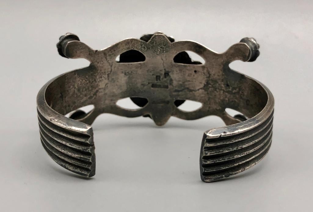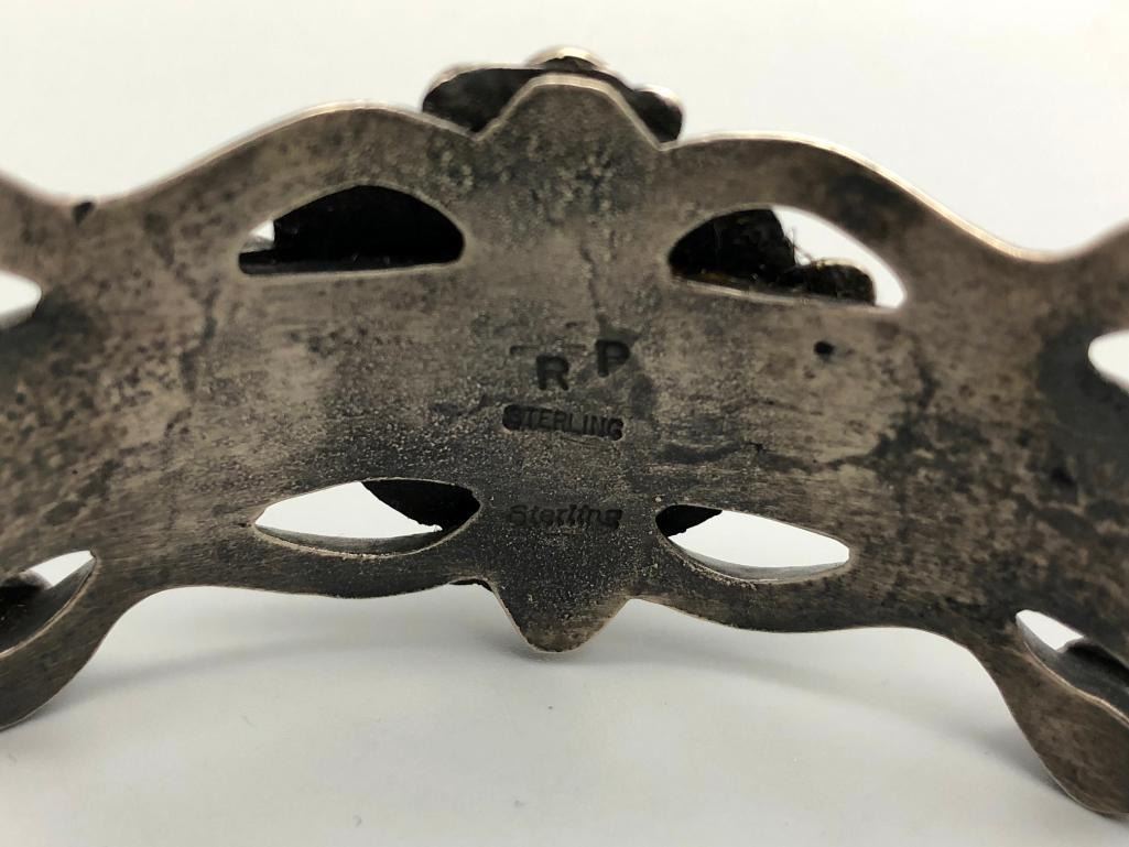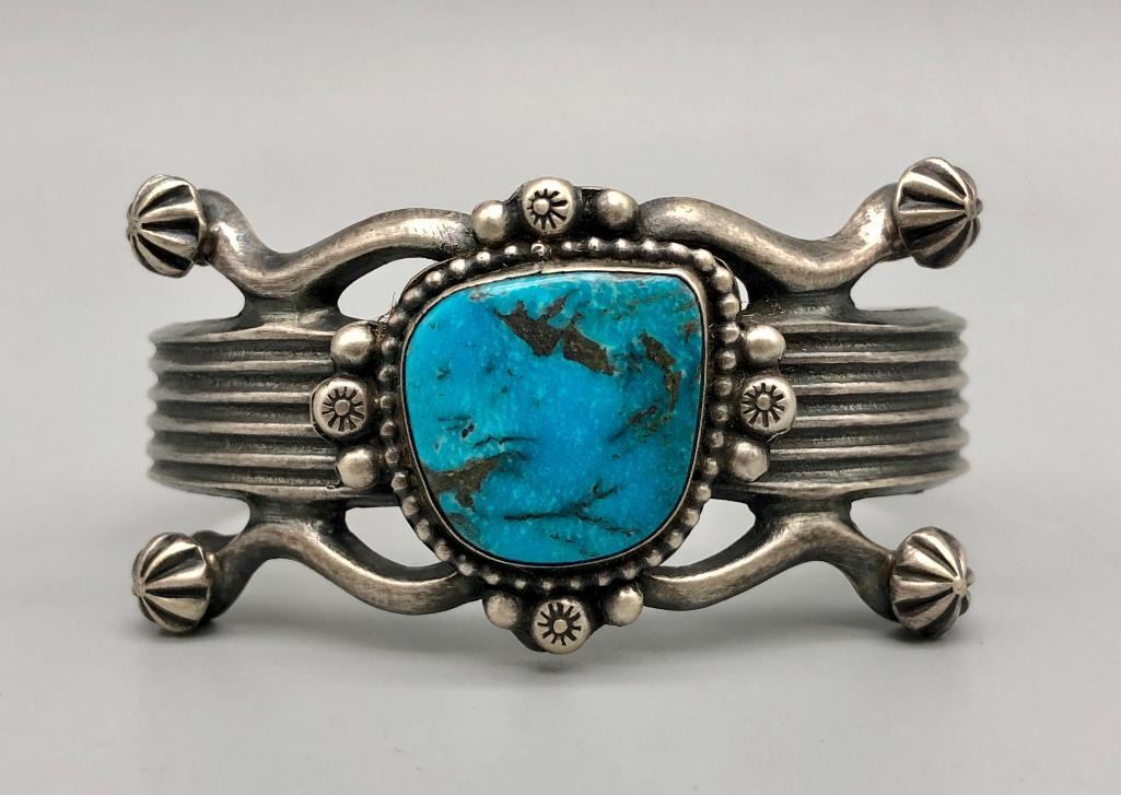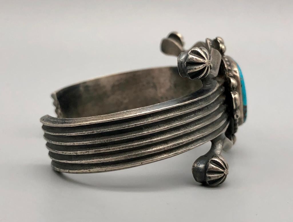 For sale in this lot is a turquoise and sterling silver bracelet. This is a awesome, retro style bracelet set with a beautiful turquoise cabochon. It has great groove work on the cuff, with unique silver "fingers", and accented with decorative drops that tie the design together. It is stamped as sterling silver. MAKER: Hallmarked RP. APPROX AGE: Contemporary. SIZE: Inside circumference measures 5-1/2 inches long. Opening is an additional 1 inch, fitting a 6-1/2 inch wrist. Width is 1-1/4 inches. Weighs 60.6 grams. CONDITION: Good for its age, normal wear expected. Please look closely at the pictures as they are an important part of our description and are hereby incorporated into the description, specifically with regards to condition. SHIPPING: There will be a $5 handling / packaging fee for shipping this lot. The actual cost of postage will be added on top of that. BUY IT NOW: If you would like to buy this item now, without waiting for the auction day to bid on it, we do offer this option (which is available up to 48 hours before the actual auction starts). The “Buy it Now†price is the high estimate of this lot (plus applicable fees and the Buyer's premium is discounted to 10% when using the Buy it Now option). If you would like to exercise this option, you must contact us by email (or phone as long as you talk to someone live). Reference this lot number and your intention to "Buy it Now."