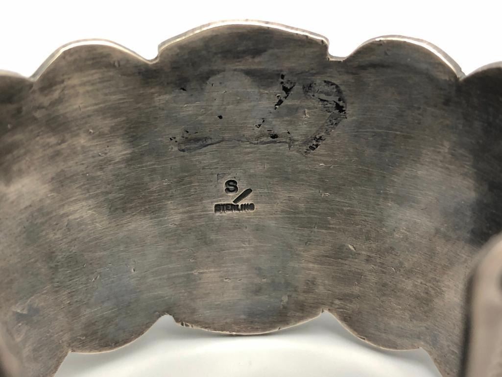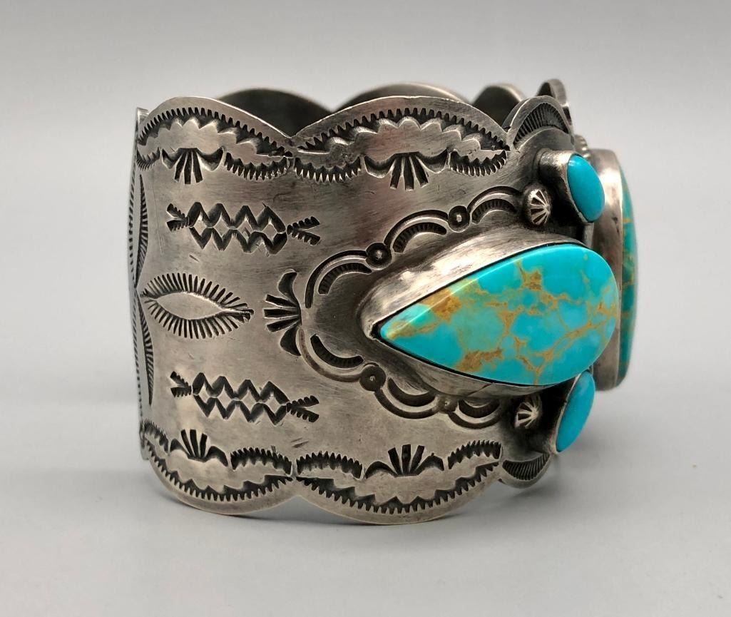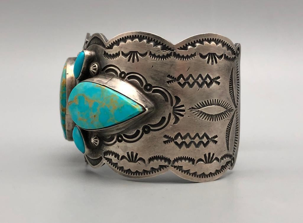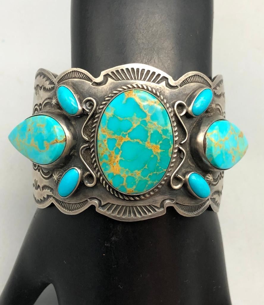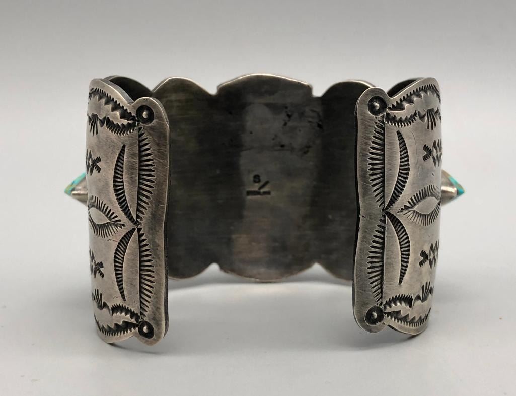 Presented for sale in this lot is a turquoise and sterling silver bracelet by Dean Sandoval Jr.. This is a great statement piece that is set with seven gorgeous turquoise cabochons. They are set on a nice wide cuff with scalloped edges. It has beautiful hand stamped designs, with a great solid feel and is stamped as sterling. MAKER: Hallmarked S/. Dean Sandoval Jr. (Navajo). APPROX AGE: Retro Style. SIZE: Inside circumference measures 6 inches long. Opening is an additional 1-1/8 inches, fitting a 7-1/8 inch wrist. Width is 1-3/4 inches. Weighs 106.4 grams. CONDITION: Good for its age, normal wear expected. Please look closely at the pictures as they are an important part of our description and are hereby incorporated into the description, specifically with regards to condition. SHIPPING: There will be a $5 handling / packaging fee for shipping this lot. The actual cost of postage will be added on top of that. BUY IT NOW: If you would like to buy this item now, without waiting for the auction day to bid on it, we do offer this option (which is available up to 48 hours before the actual auction starts). The “Buy it Now†price is the high estimate of this lot (plus applicable fees and the Buyer's premium is discounted to 10% when using the Buy it Now option). If you would like to exercise this option, you must contact us by email (or phone as long as you talk to someone live). Reference this lot number and your intention to "Buy it Now."