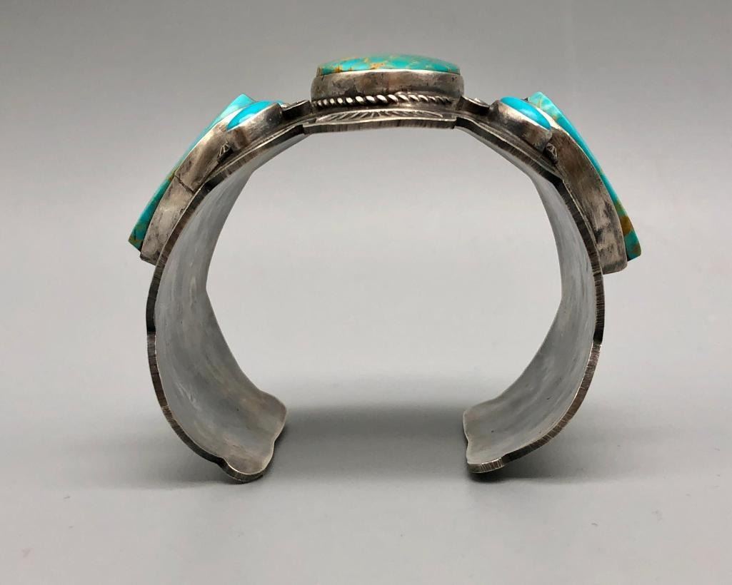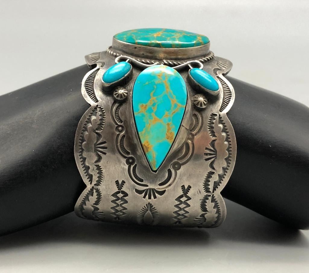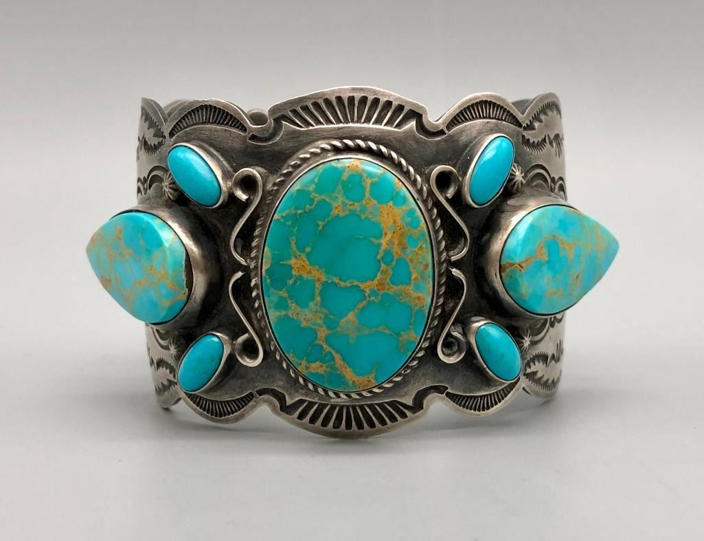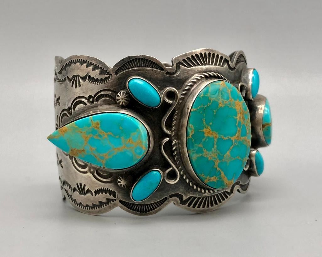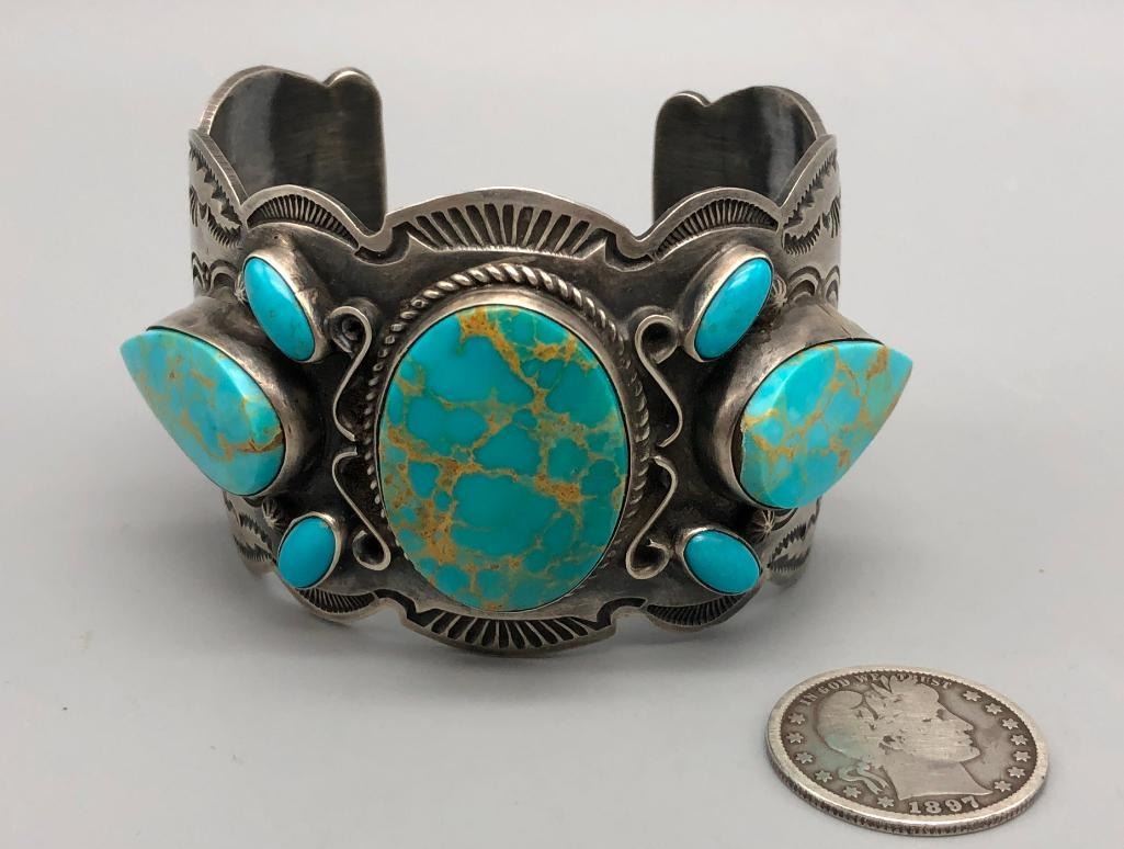 Presented for sale in this lot is a turquoise and sterling silver bracelet by Dean Sandoval Jr.. This is a great statement piece that is set with seven gorgeous turquoise cabochons. They are set on a nice wide cuff with scalloped edges. It has beautiful hand stamped designs, with a great solid feel and is stamped as sterling. MAKER: Hallmarked S/. Dean Sandoval Jr. (Navajo). APPROX AGE: Retro Style. SIZE: Inside circumference measures 6 inches long. Opening is an additional 1-1/8 inches, fitting a 7-1/8 inch wrist. Width is 1-3/4 inches. Weighs 106.4 grams. CONDITION: Good for its age, normal wear expected. Please look closely at the pictures as they are an important part of our description and are hereby incorporated into the description, specifically with regards to condition. SHIPPING: There will be a $5 handling / packaging fee for shipping this lot. The actual cost of postage will be added on top of that. BUY IT NOW: If you would like to buy this item now, without waiting for the auction day to bid on it, we do offer this option (which is available up to 48 hours before the actual auction starts). The “Buy it Now†price is the high estimate of this lot (plus applicable fees and the Buyer's premium is discounted to 10% when using the Buy it Now option). If you would like to exercise this option, you must contact us by email (or phone as long as you talk to someone live). Reference this lot number and your intention to "Buy it Now."