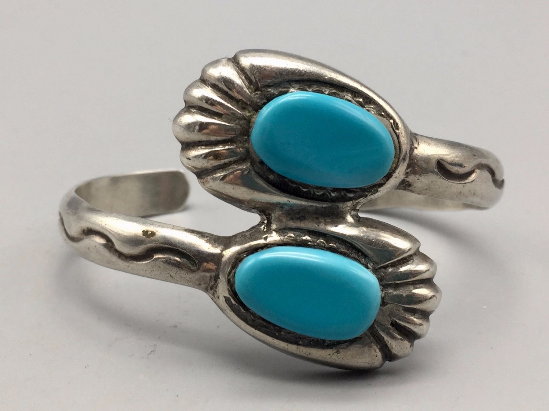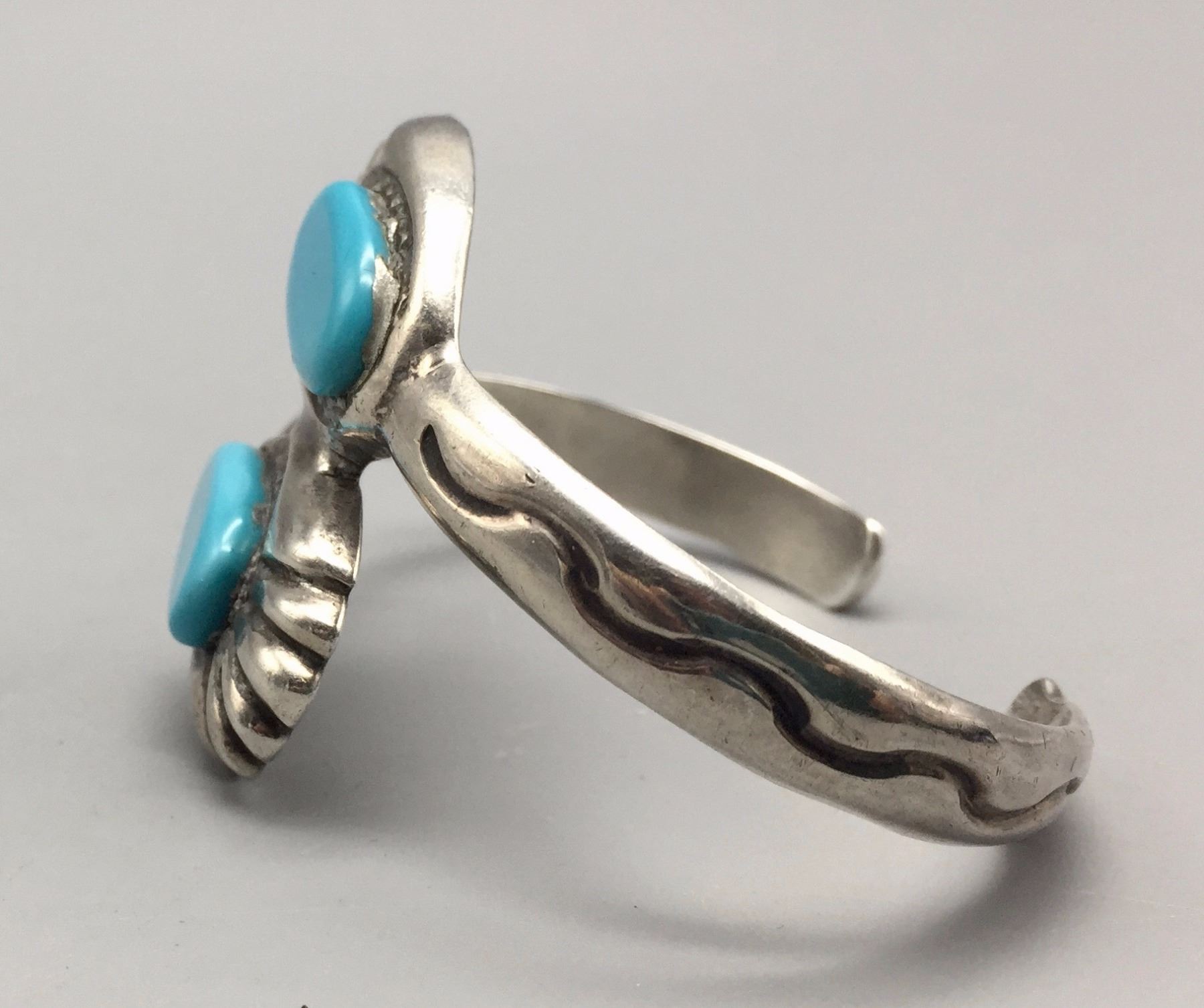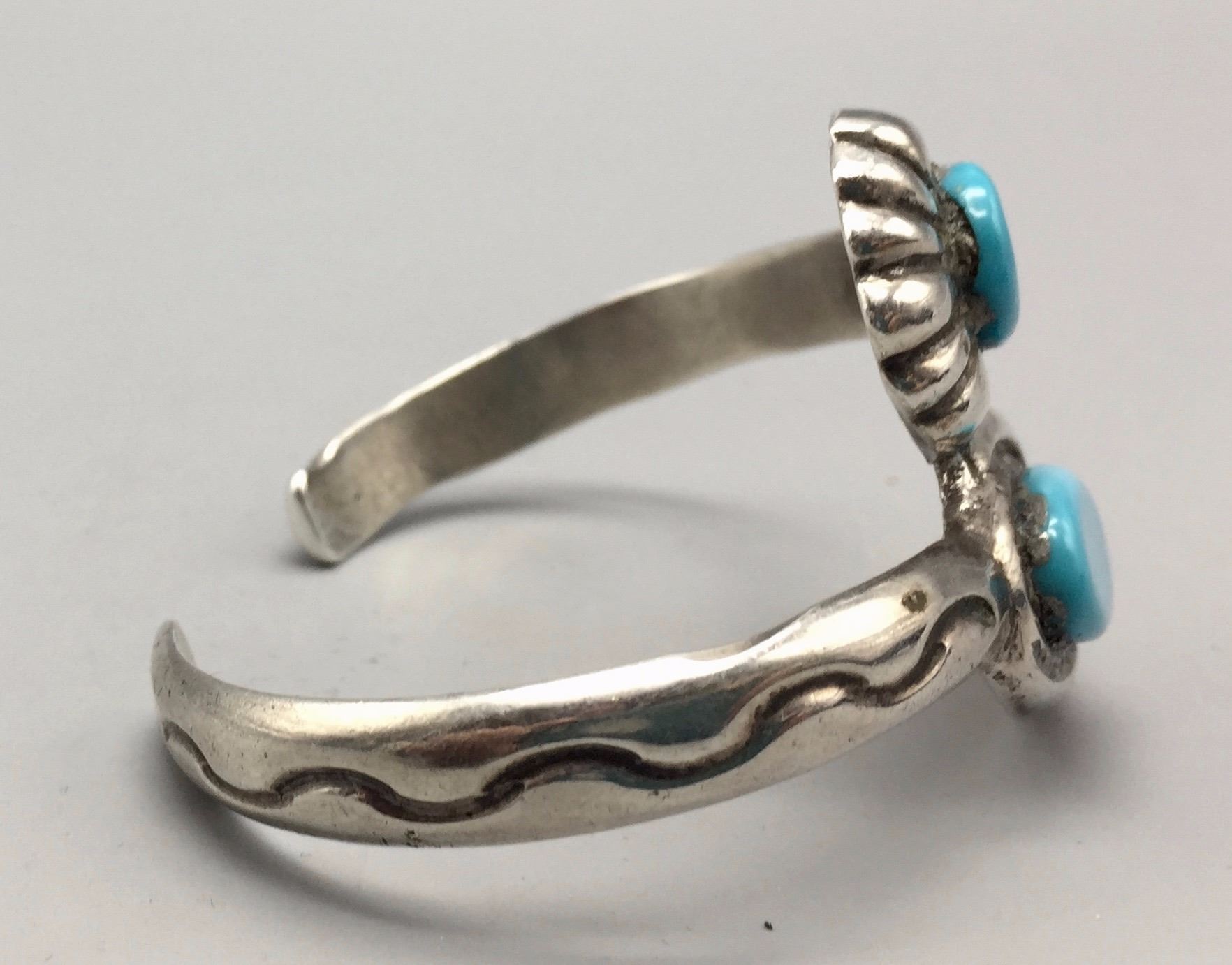 Maker: Unmarked, most likely Navajo. Approx. Age: Circa 1970s - 80s. Size: Inside circumference of bracelet is 5 5/8” plus it has a 1” opening (making it fit a 6 5/8” wrist). Bracelet is 1 1/2” at it’s widest point and weighs 45.7 g. Additional Info: Cuff bracelet features two turquoise cabochons and hand-stamping in the silver work. Tested as sterling silver. Condition: Good. Normal wear expected. Please look closely at the pictures - they are an important part of our description. Shipping: There will be a $5 handling / packaging fee for shipping this lot. The actual cost of postage will be added on top of that.