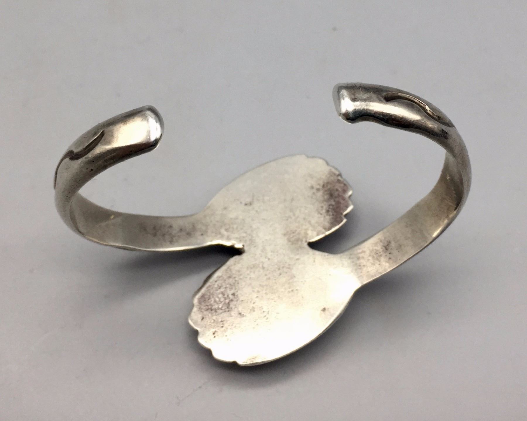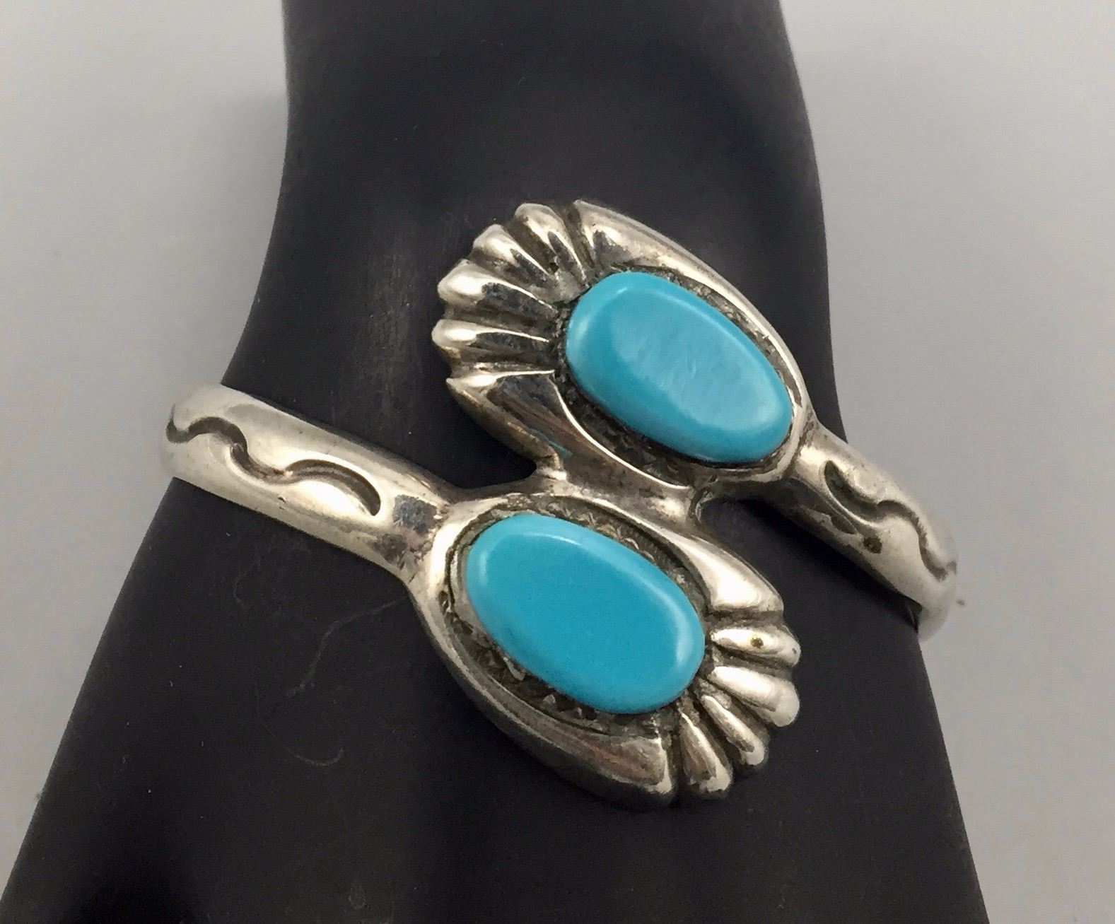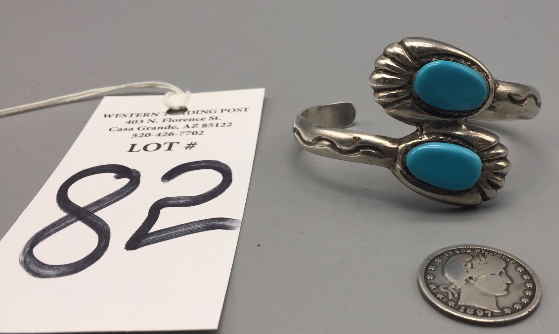 Maker: Unmarked, most likely Navajo. Approx. Age: Circa 1970s - 80s. Size: Inside circumference of bracelet is 5 5/8” plus it has a 1” opening (making it fit a 6 5/8” wrist). Bracelet is 1 1/2” at it’s widest point and weighs 45.7 g. Additional Info: Cuff bracelet features two turquoise cabochons and hand-stamping in the silver work. Tested as sterling silver. Condition: Good. Normal wear expected. Please look closely at the pictures - they are an important part of our description. Shipping: There will be a $5 handling / packaging fee for shipping this lot. The actual cost of postage will be added on top of that.
