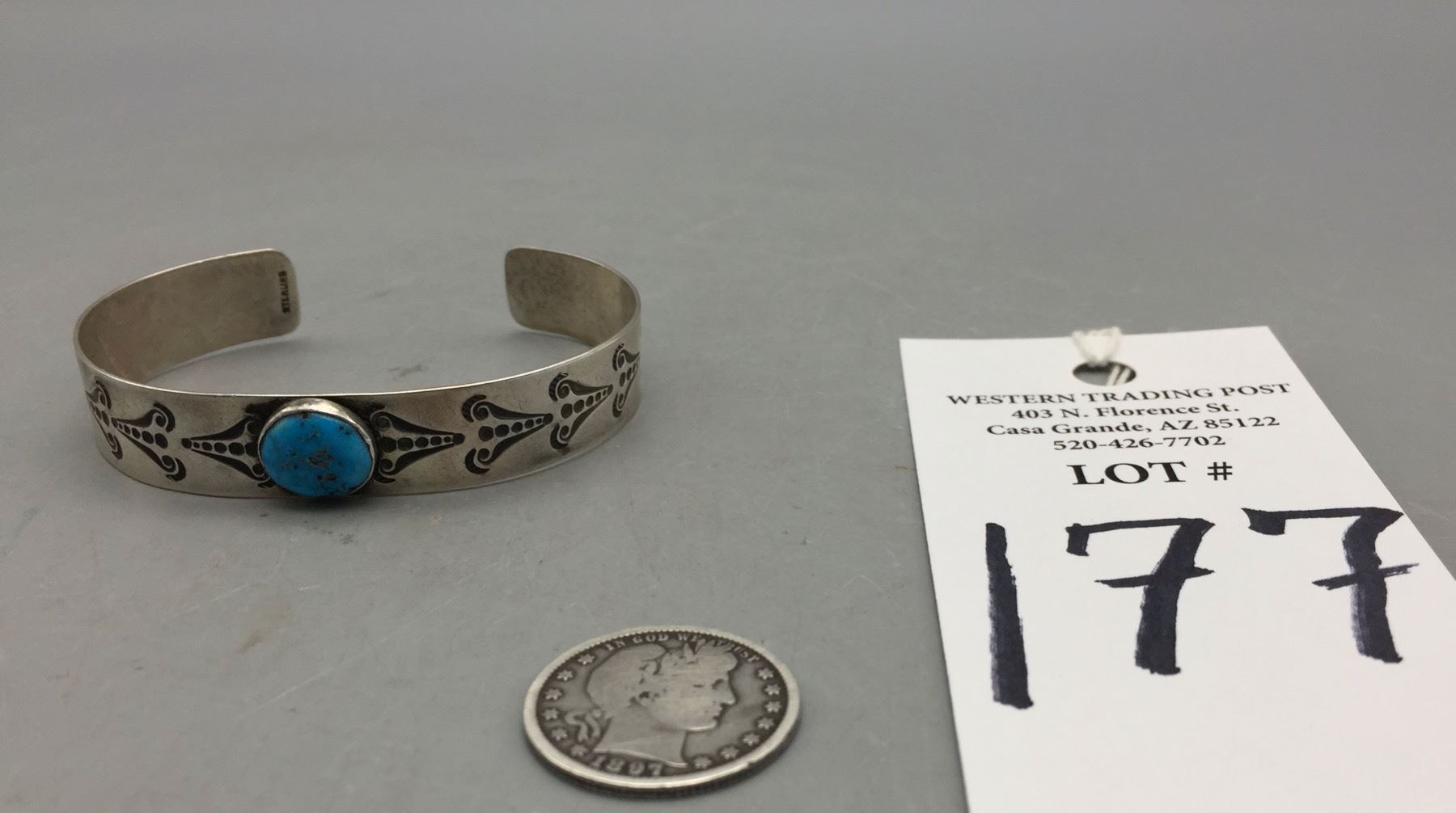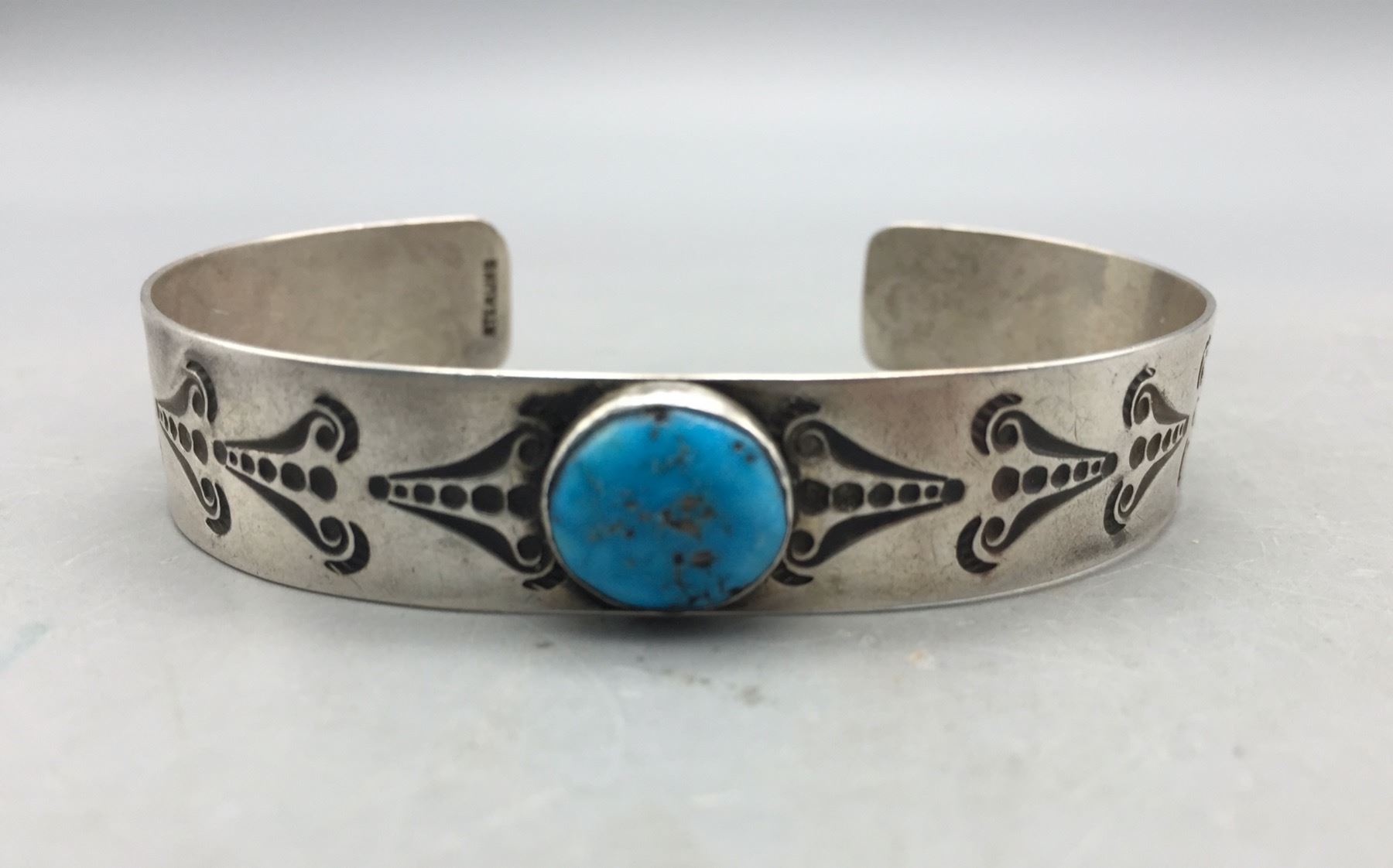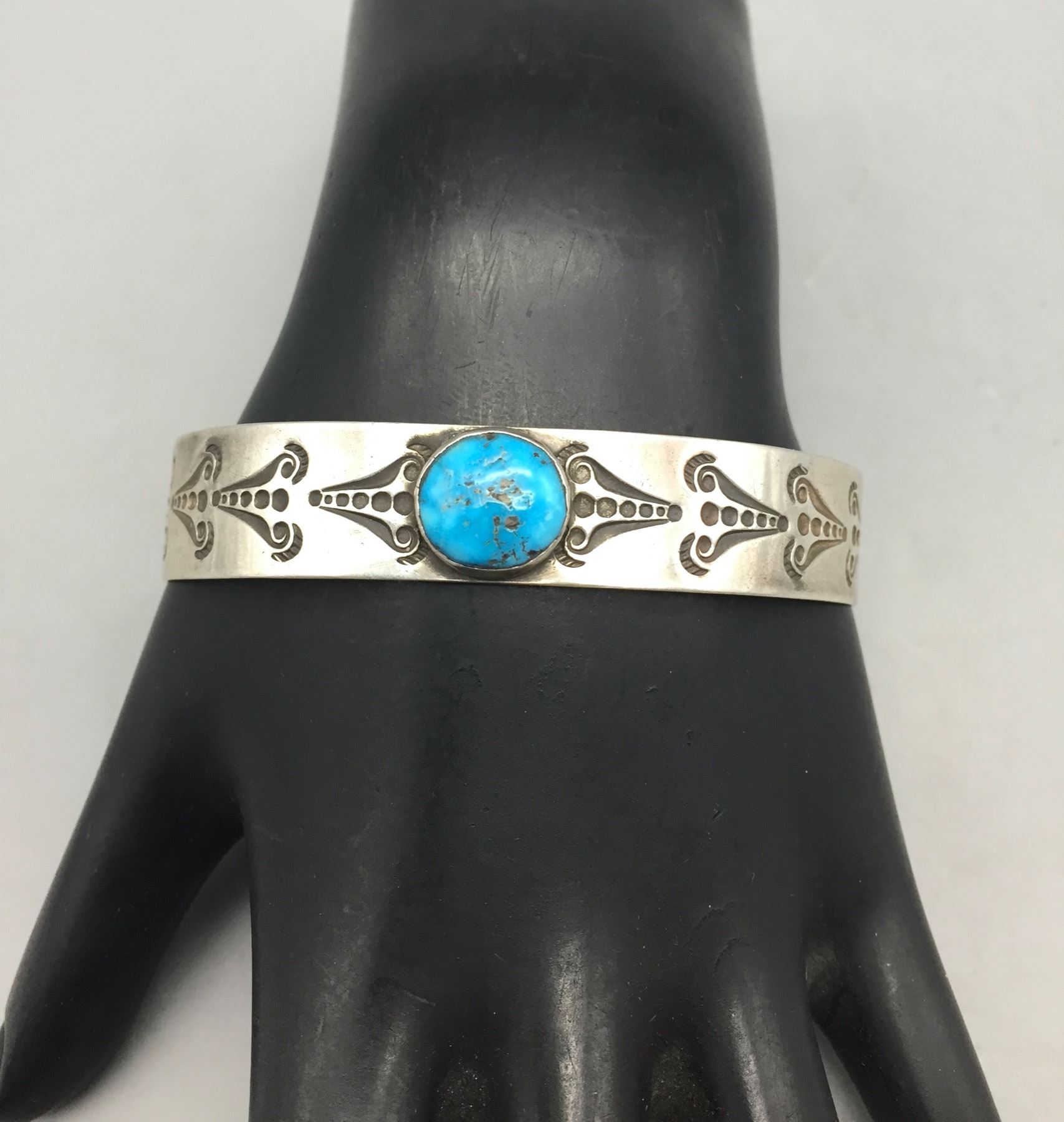 Description: Presented for sale in this lot is a nice turquoise and sterling silver bracelet. It has nice stamp work and is set with a turquoise stone in sterling silver. Maker: Unknown. Approx. Age: Vintage. Size: Inside circumference measures 6â€. Opening is an additional 1-1/8â€, fitting a 7-1/8†wrist. Width is 1/2â€. Weigh 15.5 grams. Condition: Good for its age, normal wear expected. Please look closely at the pictures - they are an important part of our description. Shipping: There will be a $5 handling / packaging fee for shipping this lot. The actual cost of postage will be added on top of that.