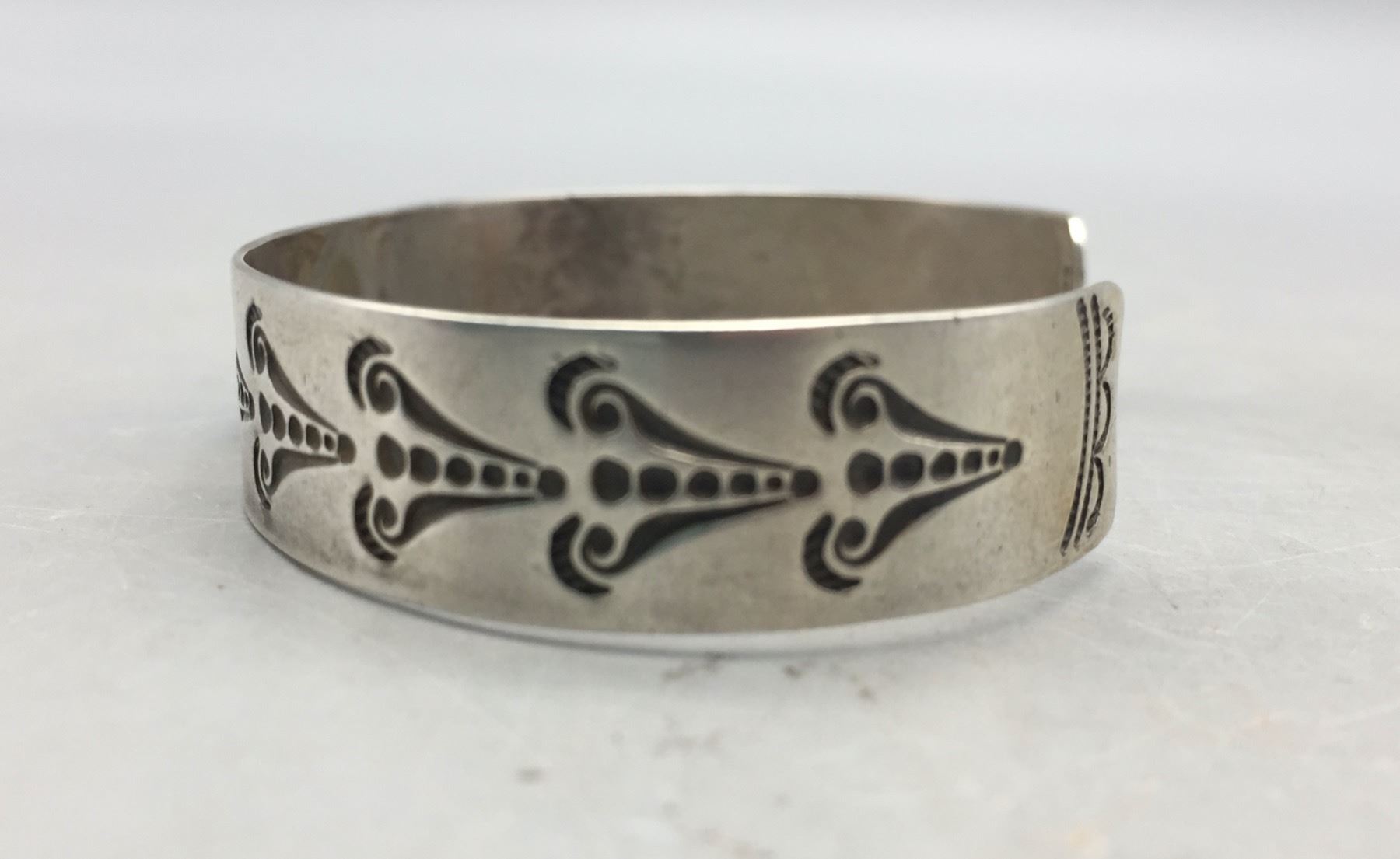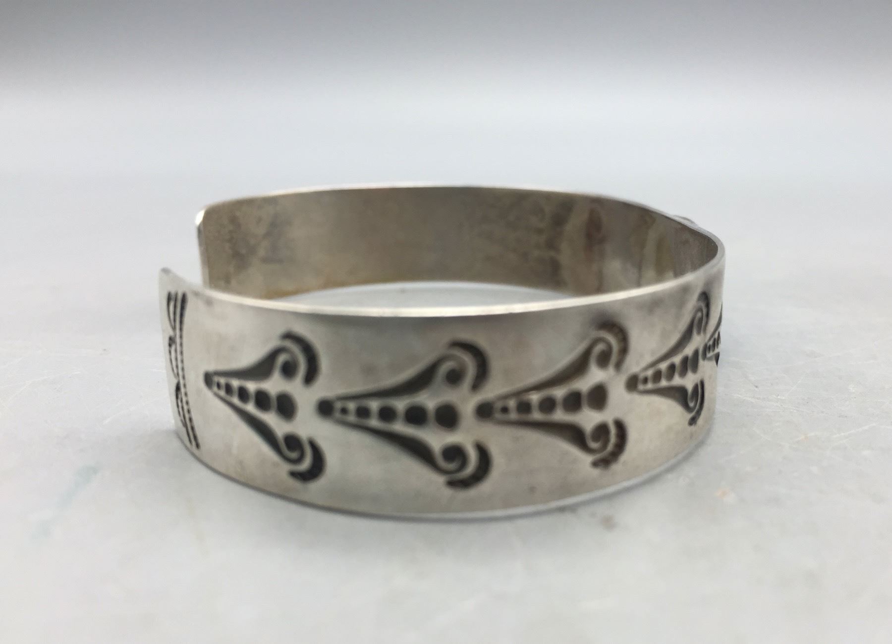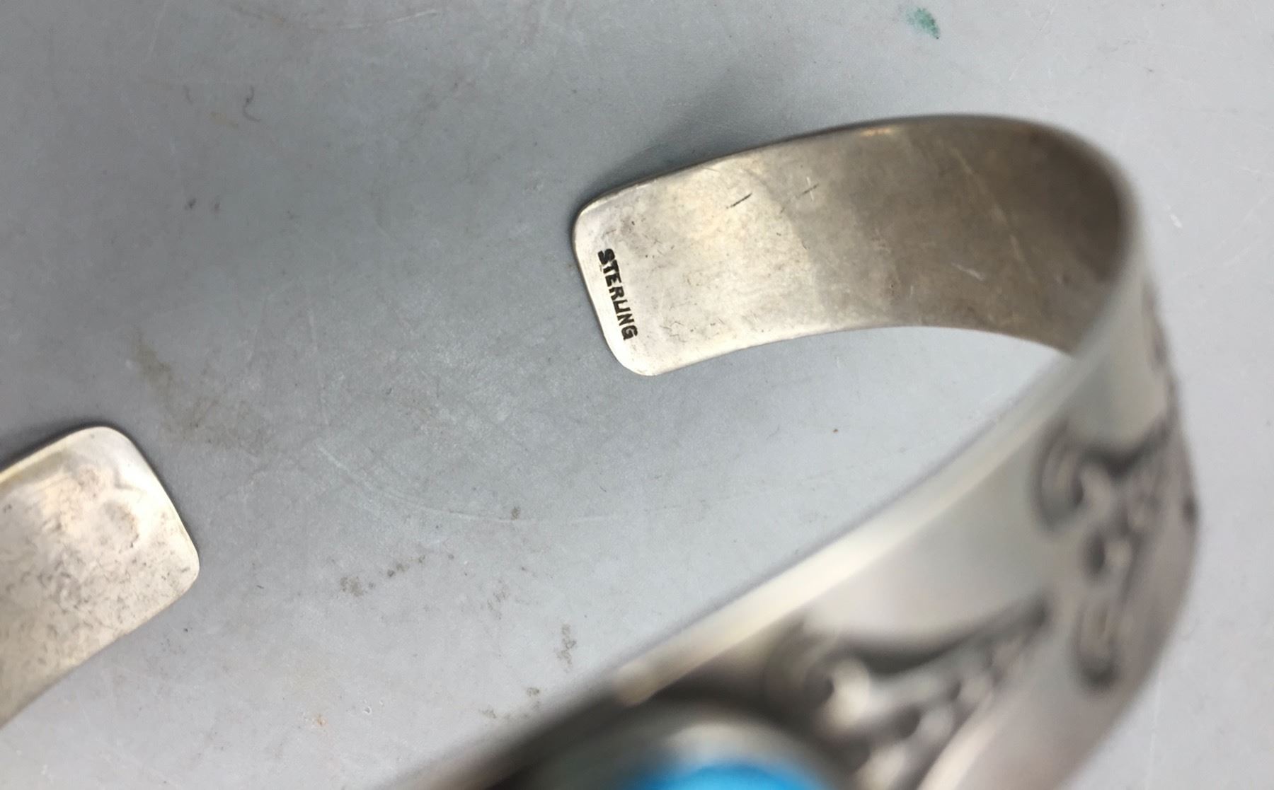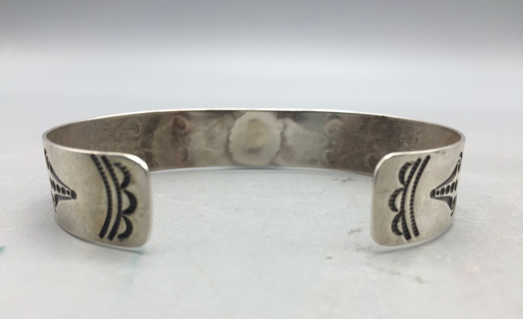Description: Presented for sale in this lot is a nice turquoise and sterling silver bracelet. It has nice stamp work and is set with a turquoise stone in sterling silver. Maker: Unknown. Approx. Age: Vintage. Size: Inside circumference measures 6â€. Opening is an additional 1-1/8â€, fitting a 7-1/8†wrist. Width is 1/2â€. Weigh 15.5 grams. Condition: Good for its age, normal wear expected. Please look closely at the pictures - they are an important part of our description. Shipping: There will be a $5 handling / packaging fee for shipping this lot. The actual cost of postage will be added on top of that.