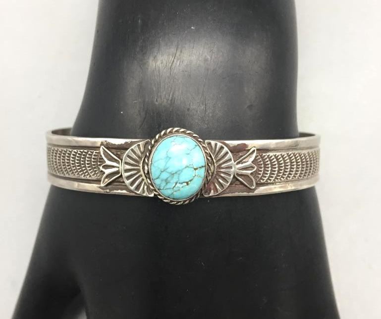 Presented for sale in this lot is a sterling silver bracelet featuring a nice looking turquoise stone with a black/brown matrix. Maker: Hallmarked RJ. Approx. Age: Contemporary. Size: Measures 5-7/8" with a 1" opening, fits a 6-7/8" wrist. It is 5/8" wide and weighs 22.1 grams. Condition: Good for its age, normal wear expected. Please look closely at the pictures - they are an important part of our description. Shipping: There will be a $5 handling, packaging fee for shipping this lot. The actual cost of postage will be added on top of that.
