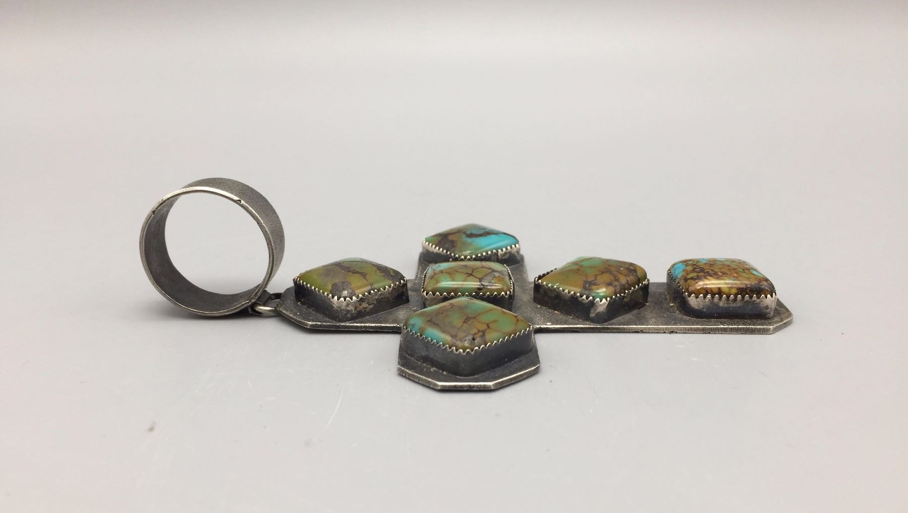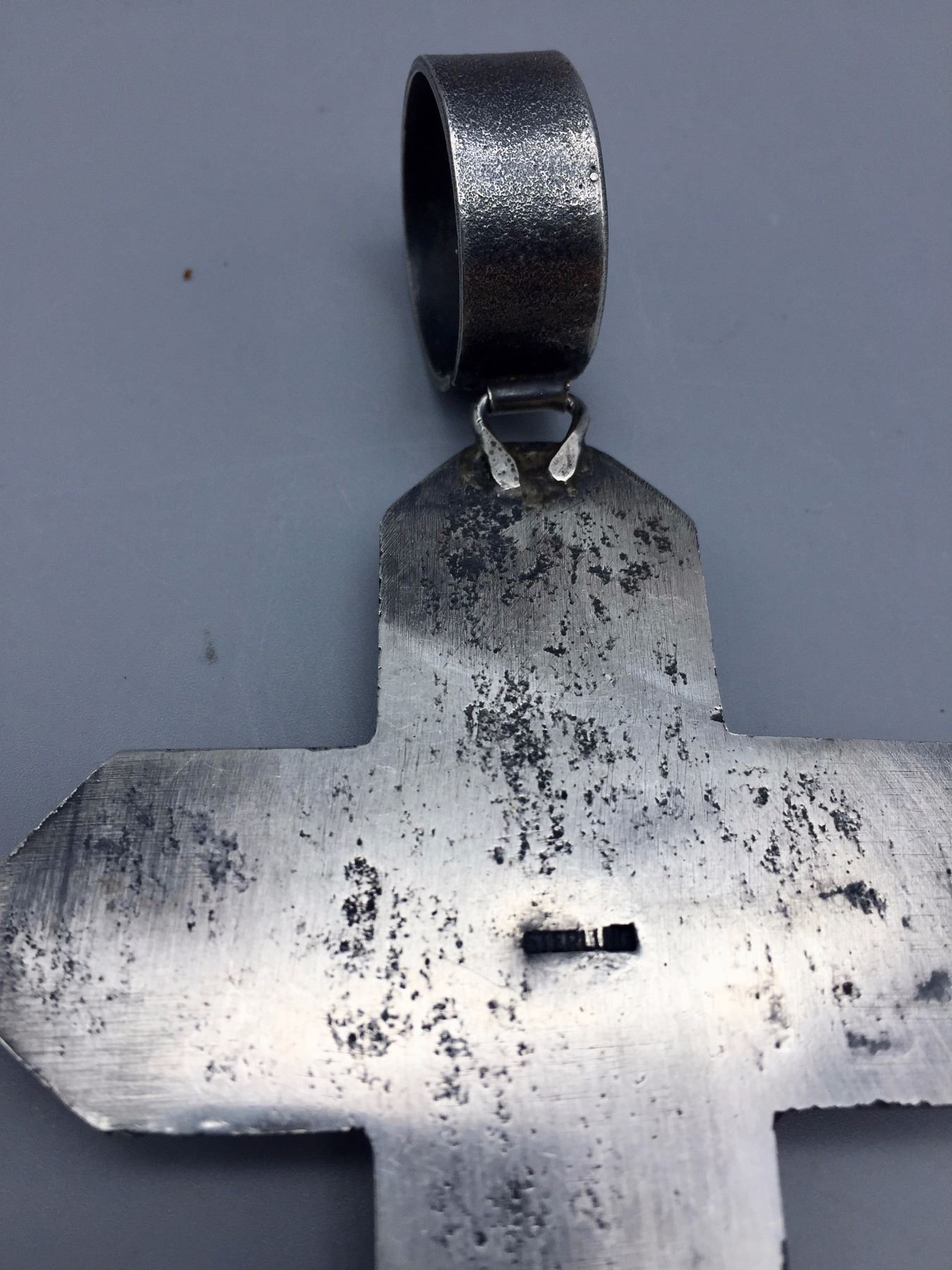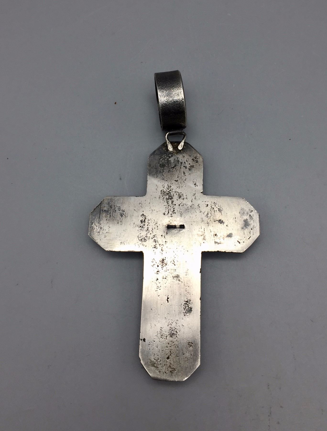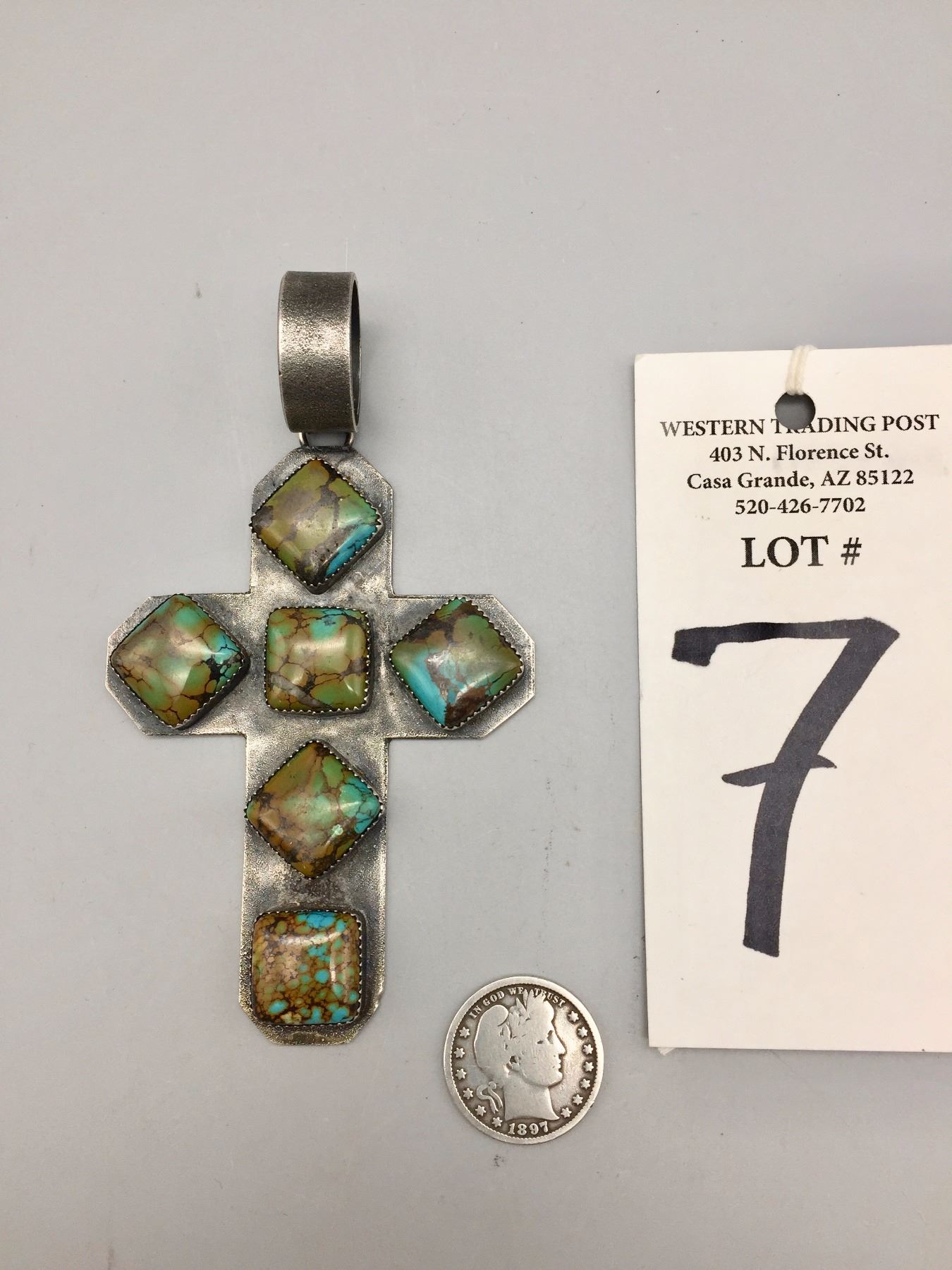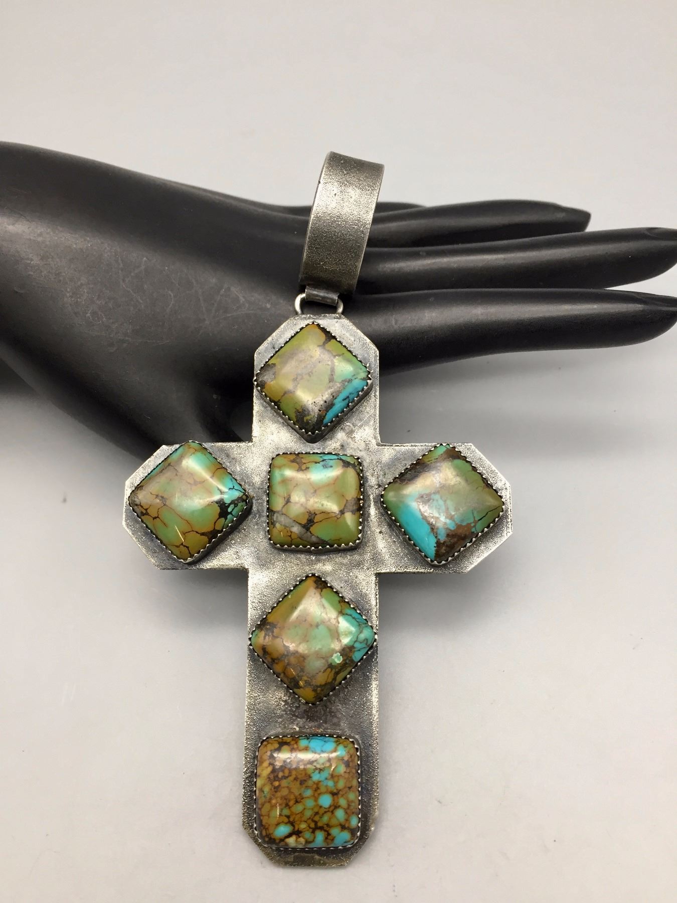 Description: Sterling silver cross with 6 great turquoise cabochons.                                                                                      Maker: Unknown.                                                                                                        Approx. Age: Fairly modern.                                                                                                   Size: Pendant measures 2 5/8" w x 4 3/4" l. Weighs 65.6 g.                                                                                                                                                                                                             Condition: Good for its age, normal wear expected. Please look closely at the pictures - they are an important part of our description. Shipping: There will be a $5 handling / packaging fee for shipping this lot. The actual cost of postage will be added on top of that.