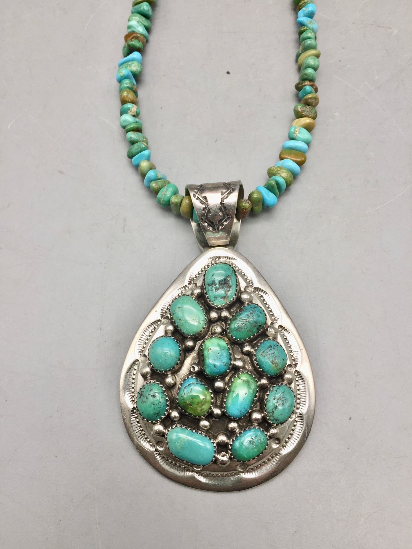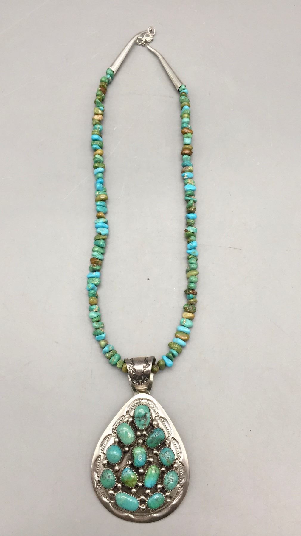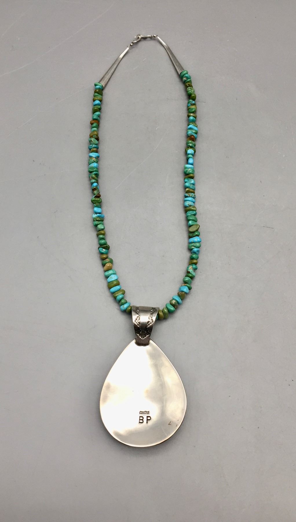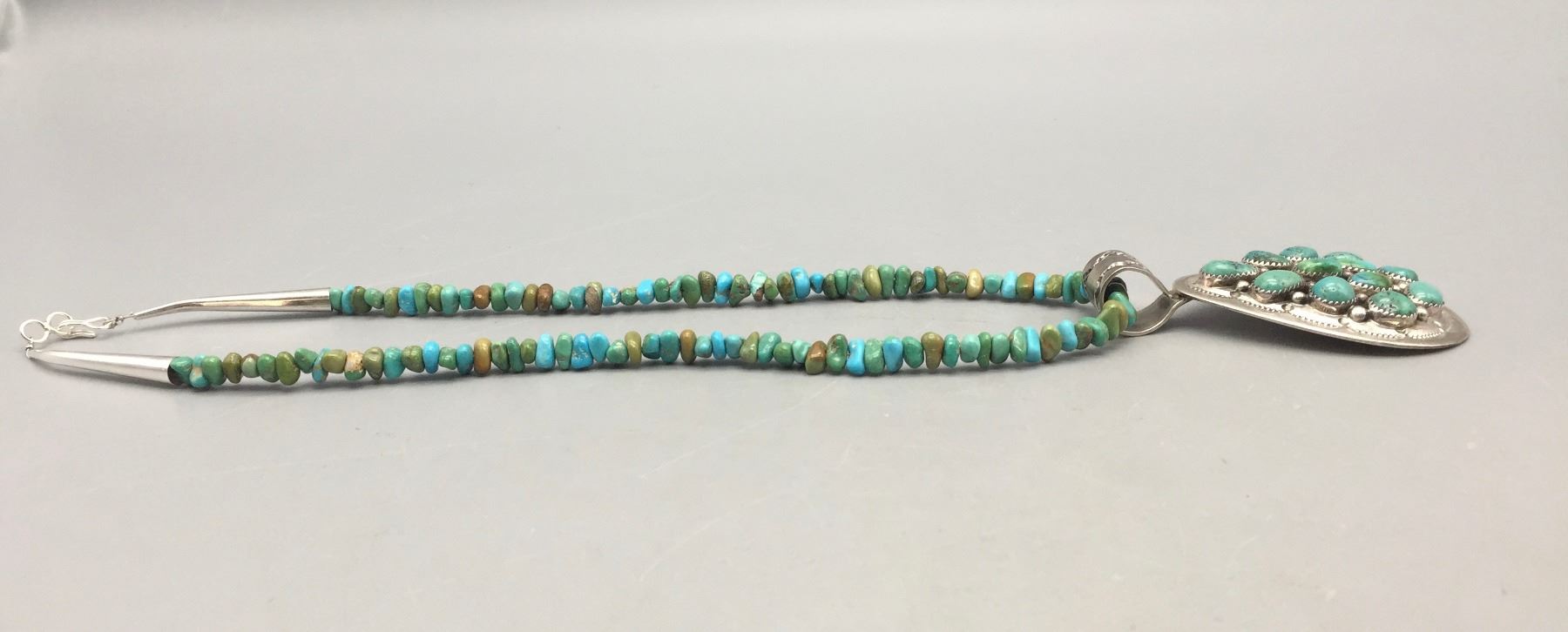 Description: Featured for sale in this lot is a green turquoise necklace with sterling silver finding and a 12 stone turquoise and sterling silver pendant featuring stamped silver. Maker: Pendant is hallmarked BP.