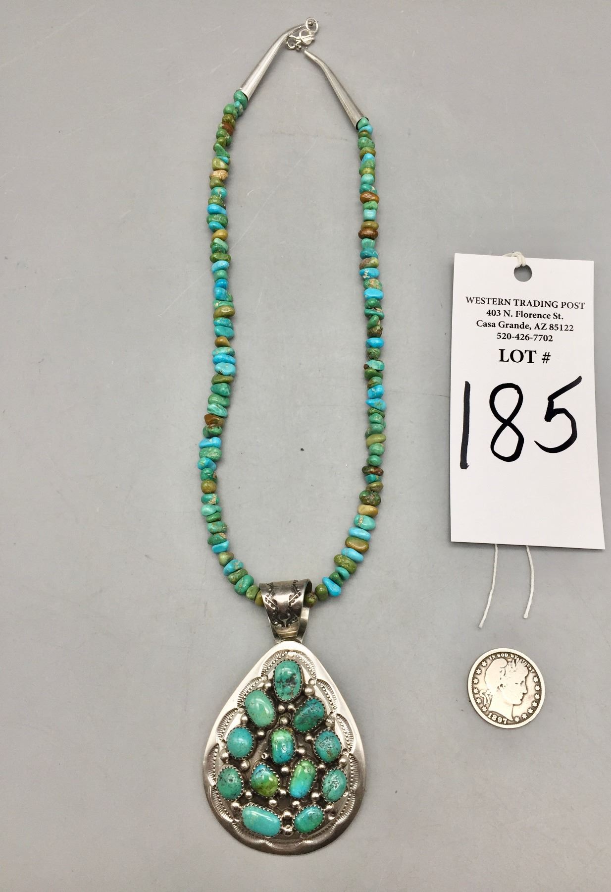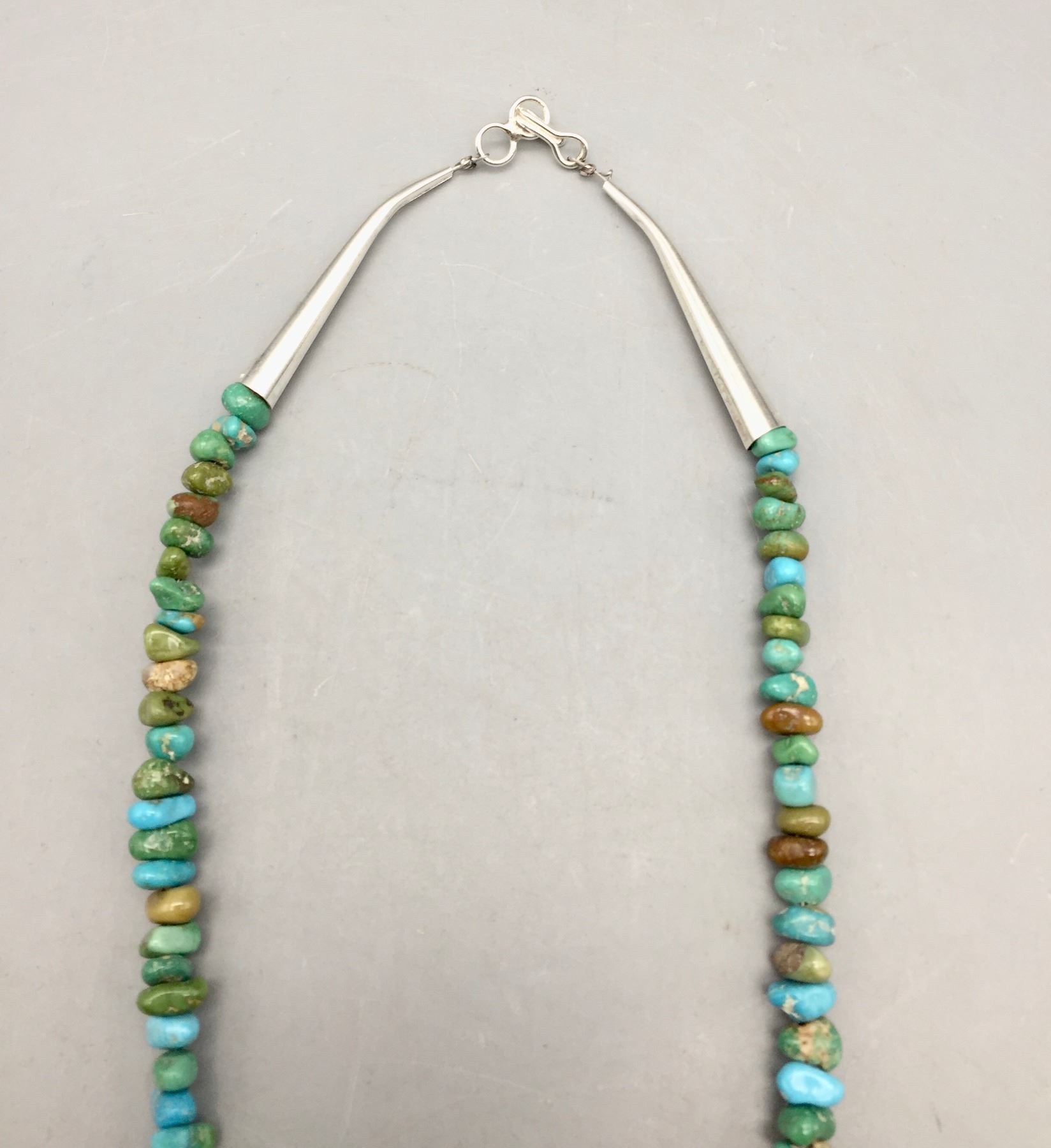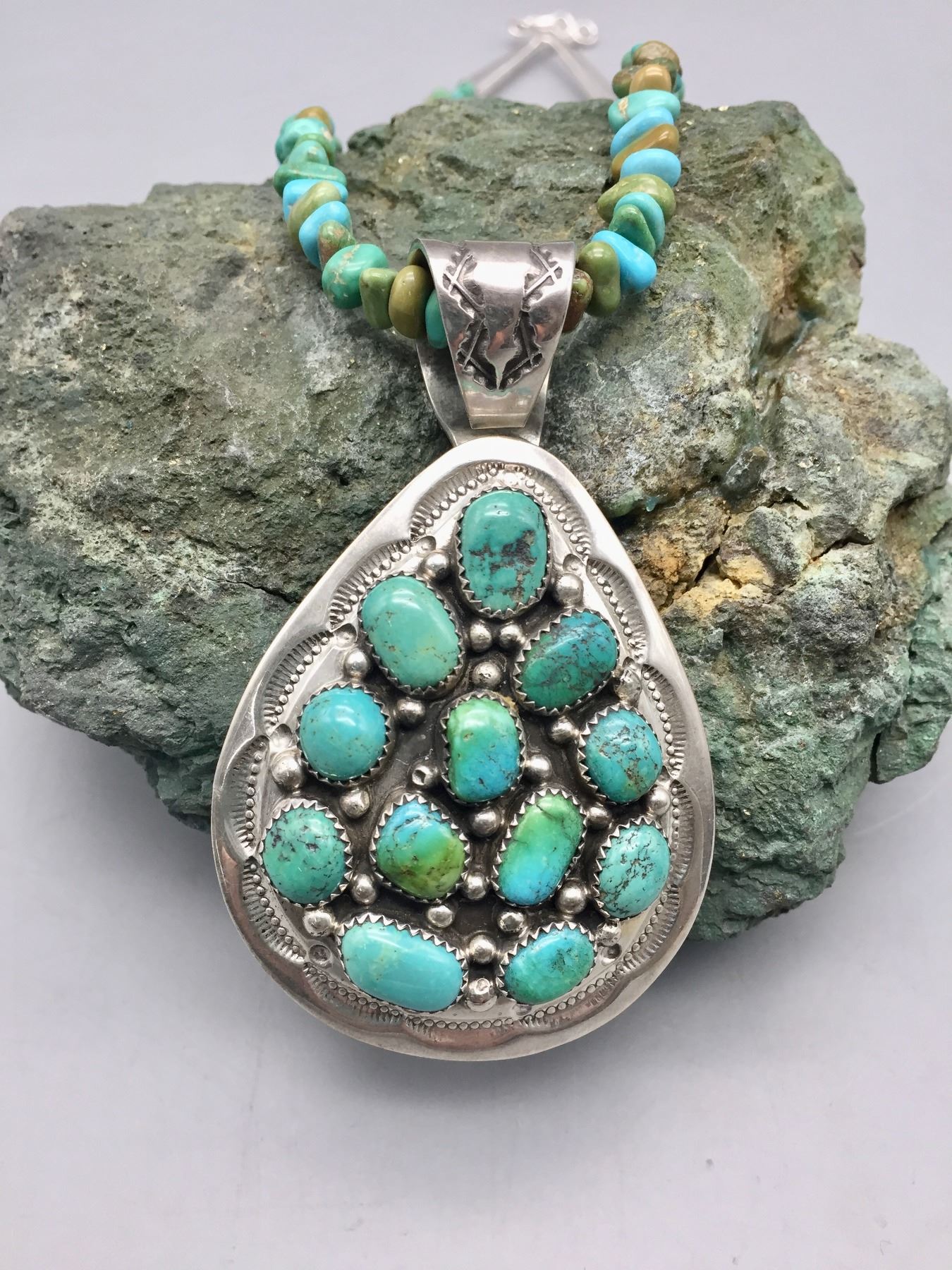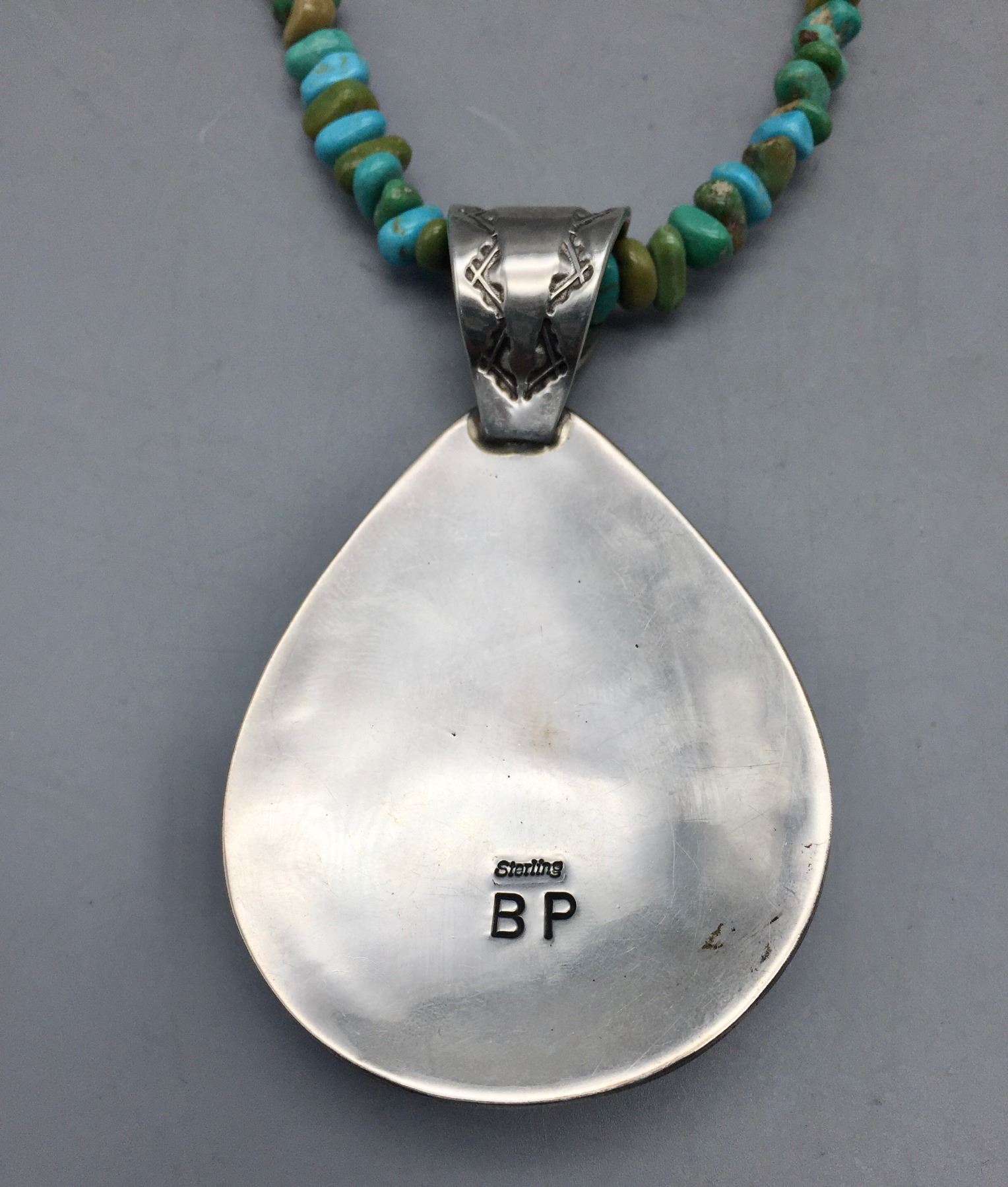 Description: Featured for sale in this lot is a green turquoise necklace with sterling silver finding and a 12 stone turquoise and sterling silver pendant featuring stamped silver. Maker: Pendant is hallmarked BP.