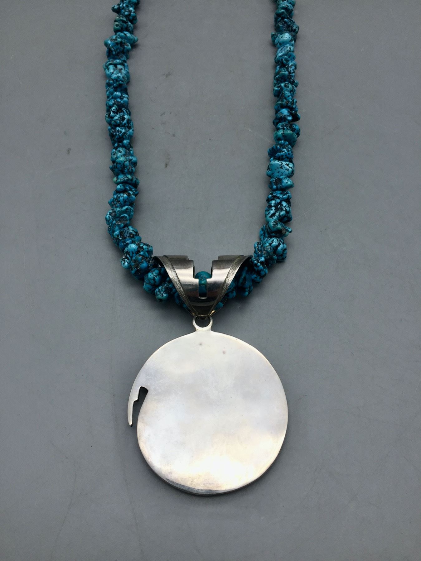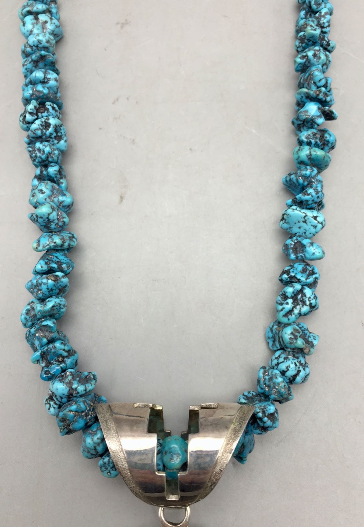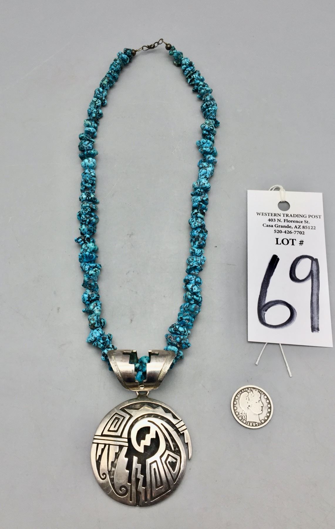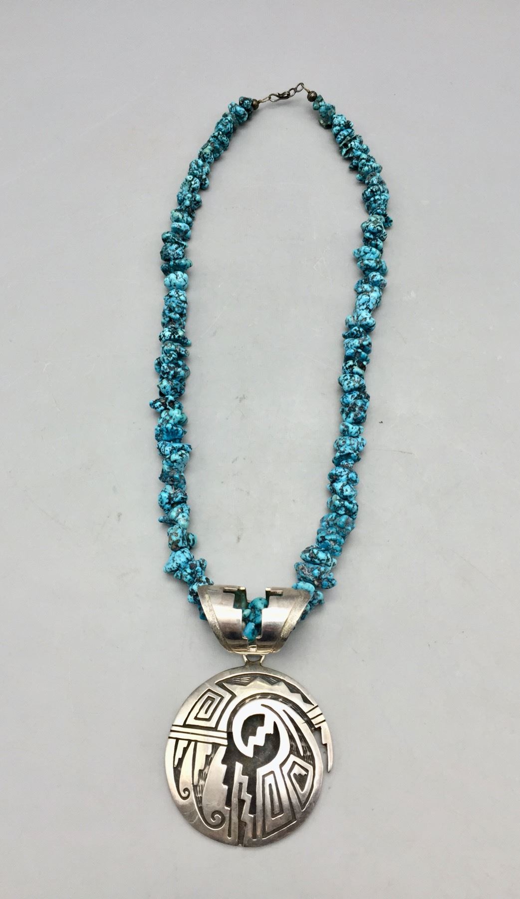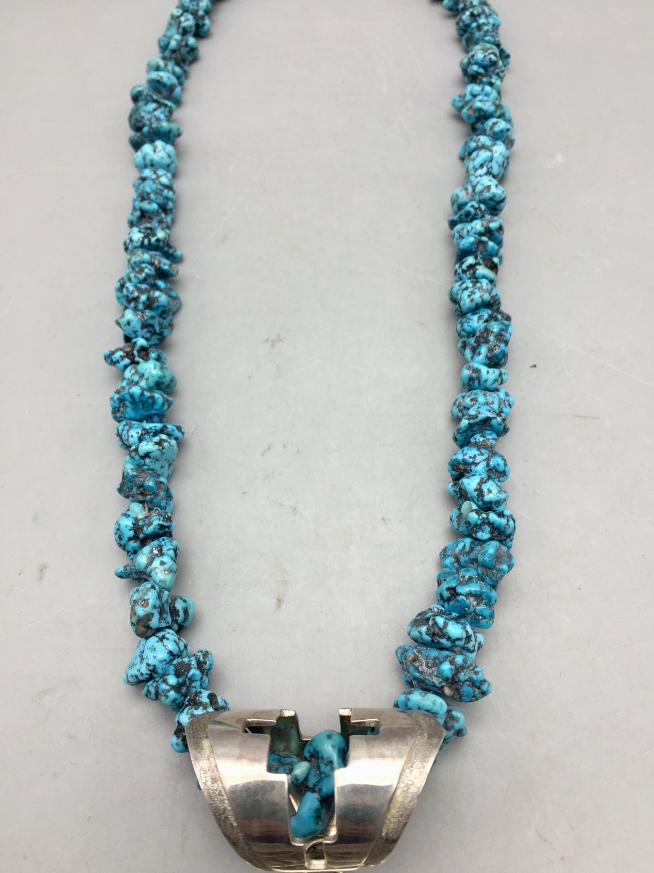 Description: Offered for sale in this lot is a turquoise and sterling silver necklace that has a gorgeous sterling silver pendant on a turquoise nugget necklace. Maker: Unknown. Approx. Age: Modern. Size: Fits a 22 inch neck. Pendant measures 3-1/4 inches long x 2-1/4 inches wide. Weighs 144.2 grams. Condition: Good for its age, minor wear expected. Please look closely at the pictures - they are an important part of our description. Shipping: There will be a $5 handling, packaging fee for shipping this lot. The actual cost of postage will be added on top of that.