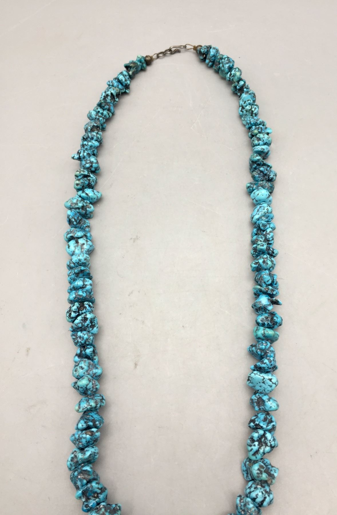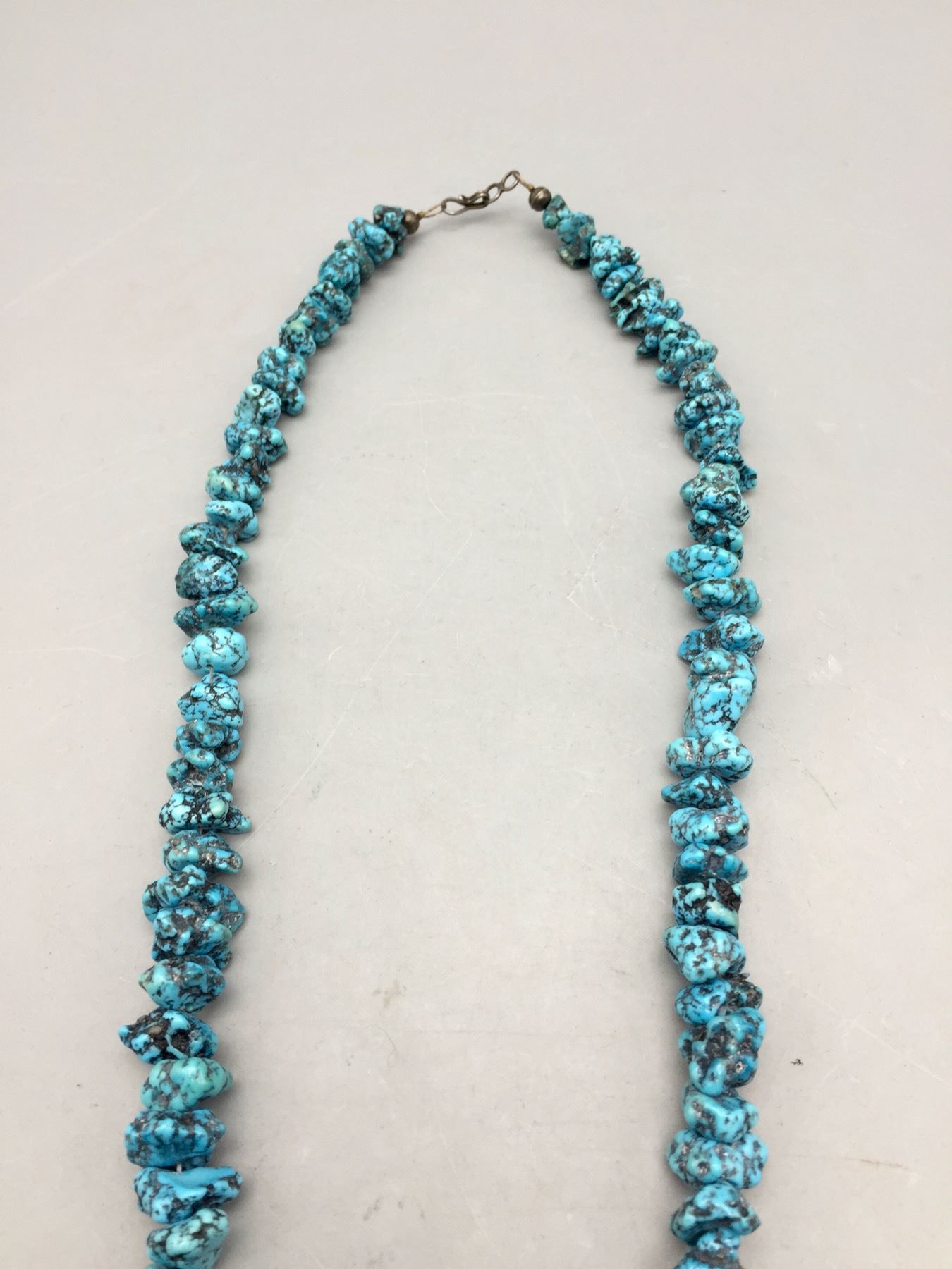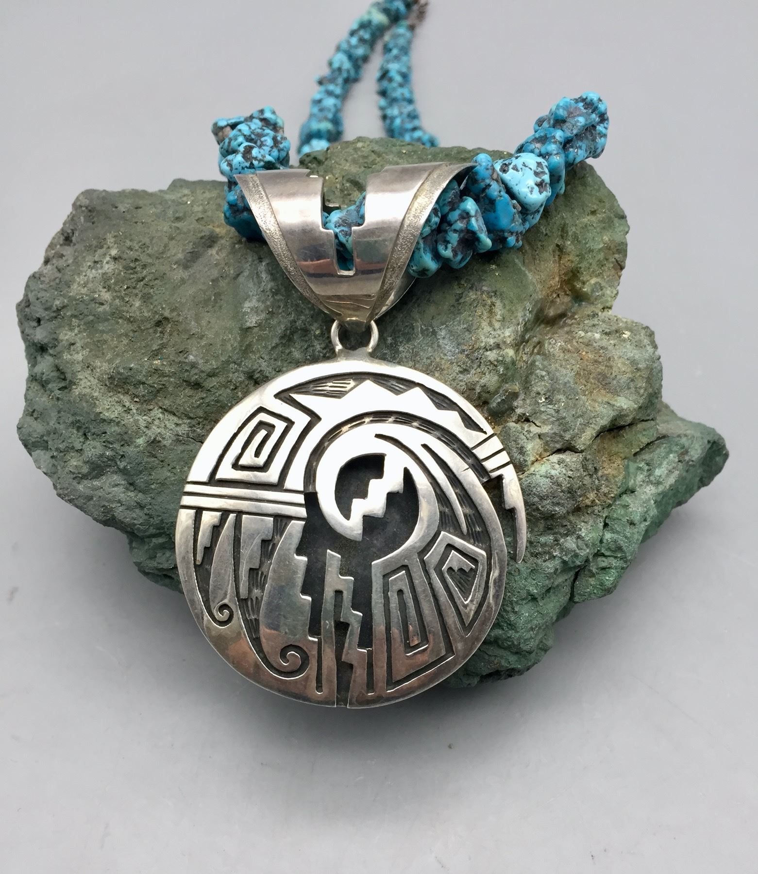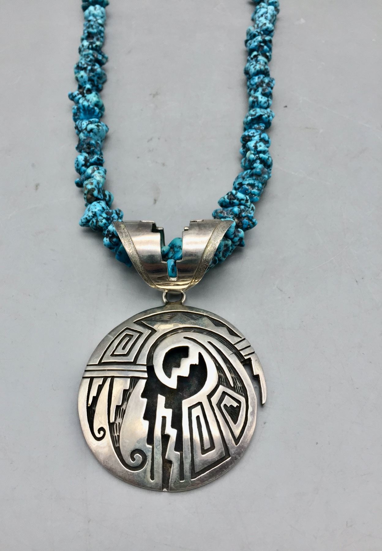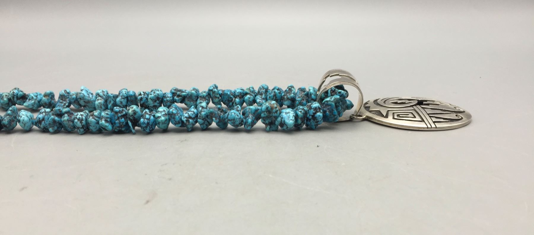 Description: Offered for sale in this lot is a turquoise and sterling silver necklace that has a gorgeous sterling silver pendant on a turquoise nugget necklace. Maker: Unknown. Approx. Age: Modern. Size: Fits a 22 inch neck. Pendant measures 3-1/4 inches long x 2-1/4 inches wide. Weighs 144.2 grams. Condition: Good for its age, minor wear expected. Please look closely at the pictures - they are an important part of our description. Shipping: There will be a $5 handling, packaging fee for shipping this lot. The actual cost of postage will be added on top of that.