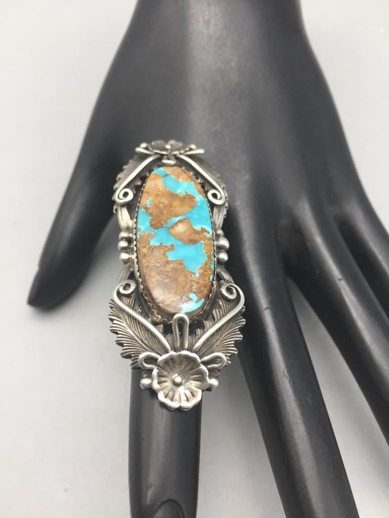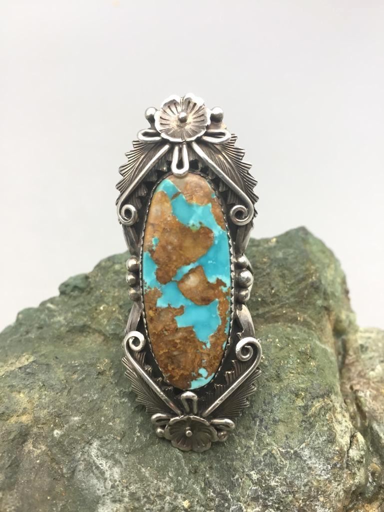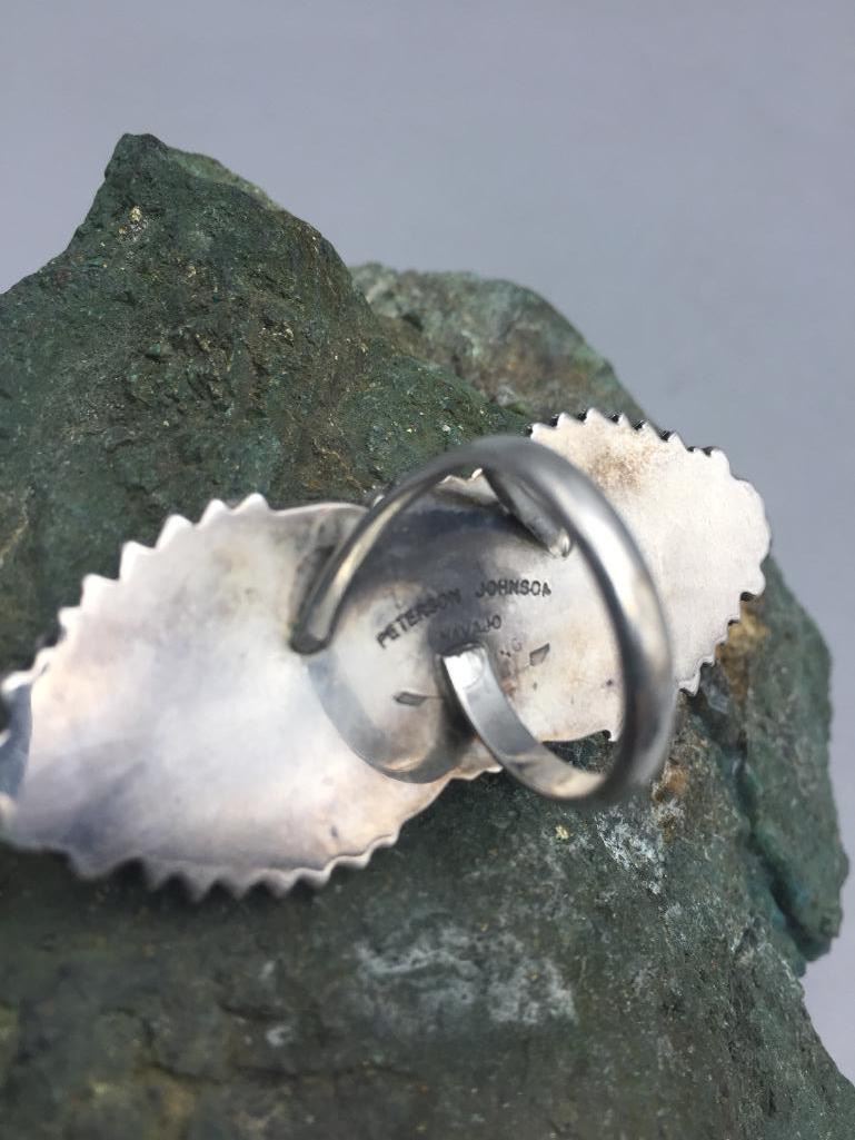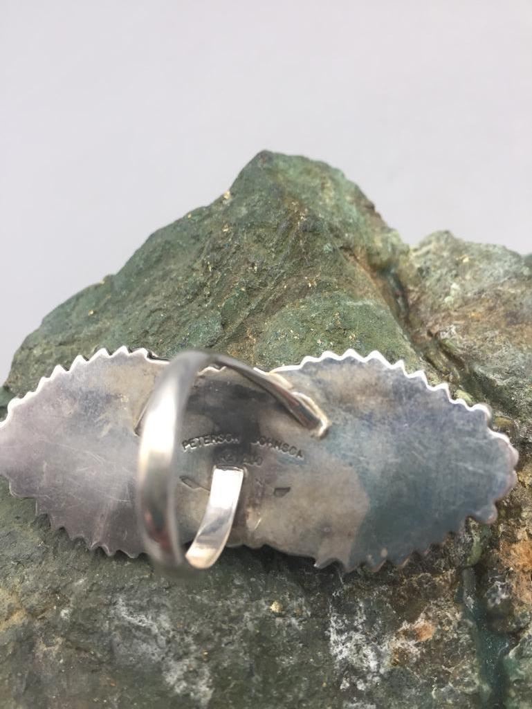 Presented for sale in this lot is a nice ring featuring a turquoise cabochon with a brown matrix surrounded by sterling silver appliqué. Maker: Peterson Johnson, Navajo. Approx. Age: Contemporary. Size: 8.5. Ring is 2-3/8" long and weighs 20.6 grams. Condition: Good for its age, normal wear expected. Please look closely at the pictures - they are an important part of our description. Shipping: There will be a $5 handling, packaging fee for shipping this lot. The actual cost of postage will be added on top of that.