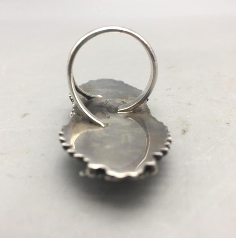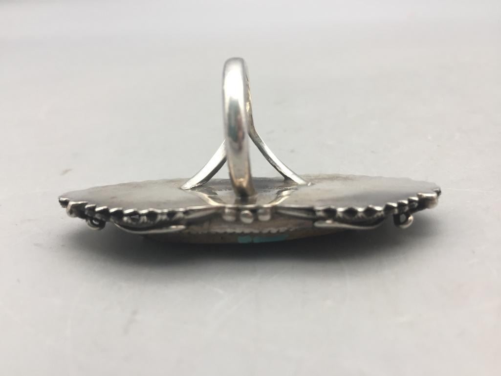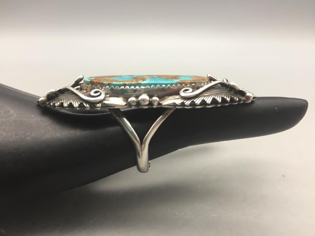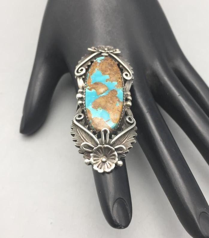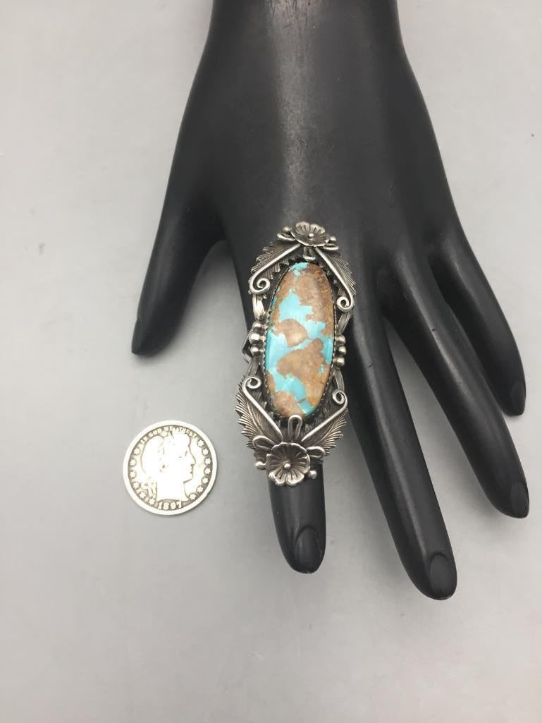Presented for sale in this lot is a nice ring featuring a turquoise cabochon with a brown matrix surrounded by sterling silver appliqué. Maker: Peterson Johnson, Navajo. Approx. Age: Contemporary. Size: 8.5. Ring is 2-3/8" long and weighs 20.6 grams. Condition: Good for its age, normal wear expected. Please look closely at the pictures - they are an important part of our description. Shipping: There will be a $5 handling, packaging fee for shipping this lot. The actual cost of postage will be added on top of that.
