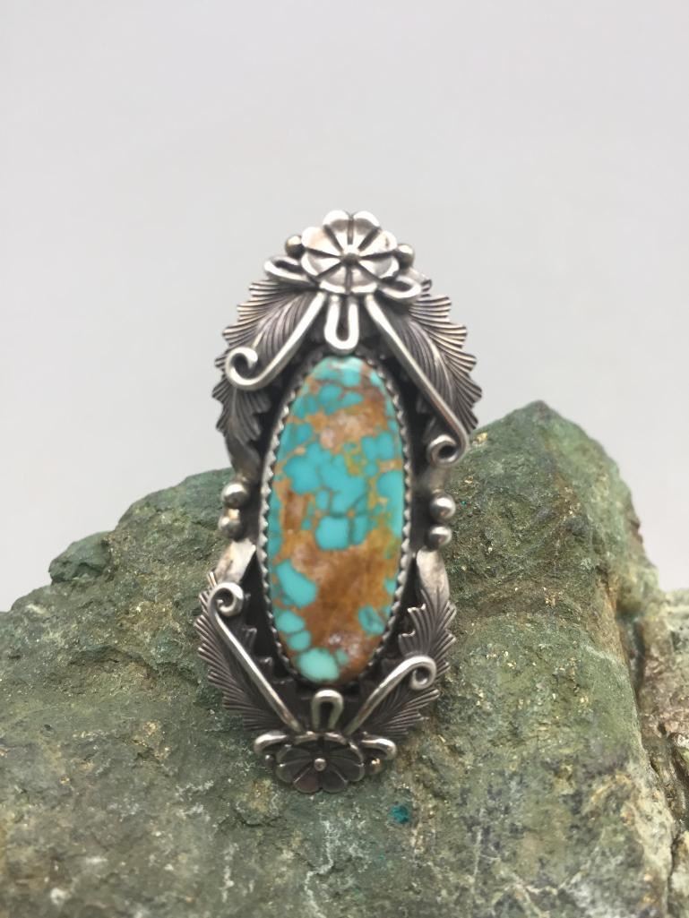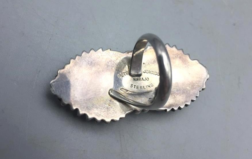 Presented for sale in this lot is a nice ring featuring a turquoise cabochon with a brown matrix surrounded by sterling silver appliqué. Maker: Peterson Johnson, Navajo. Approx. Age: Contemporary. Size: 6. Ring is 1-7/8" long and weighs 14.9 grams. Condition: Good for its age, normal wear expected. Please look closely at the pictures - they are an important part of our description. Shipping: There will be a $5 handling, packaging fee for shipping this lot. The actual cost of postage will be added on top of that.