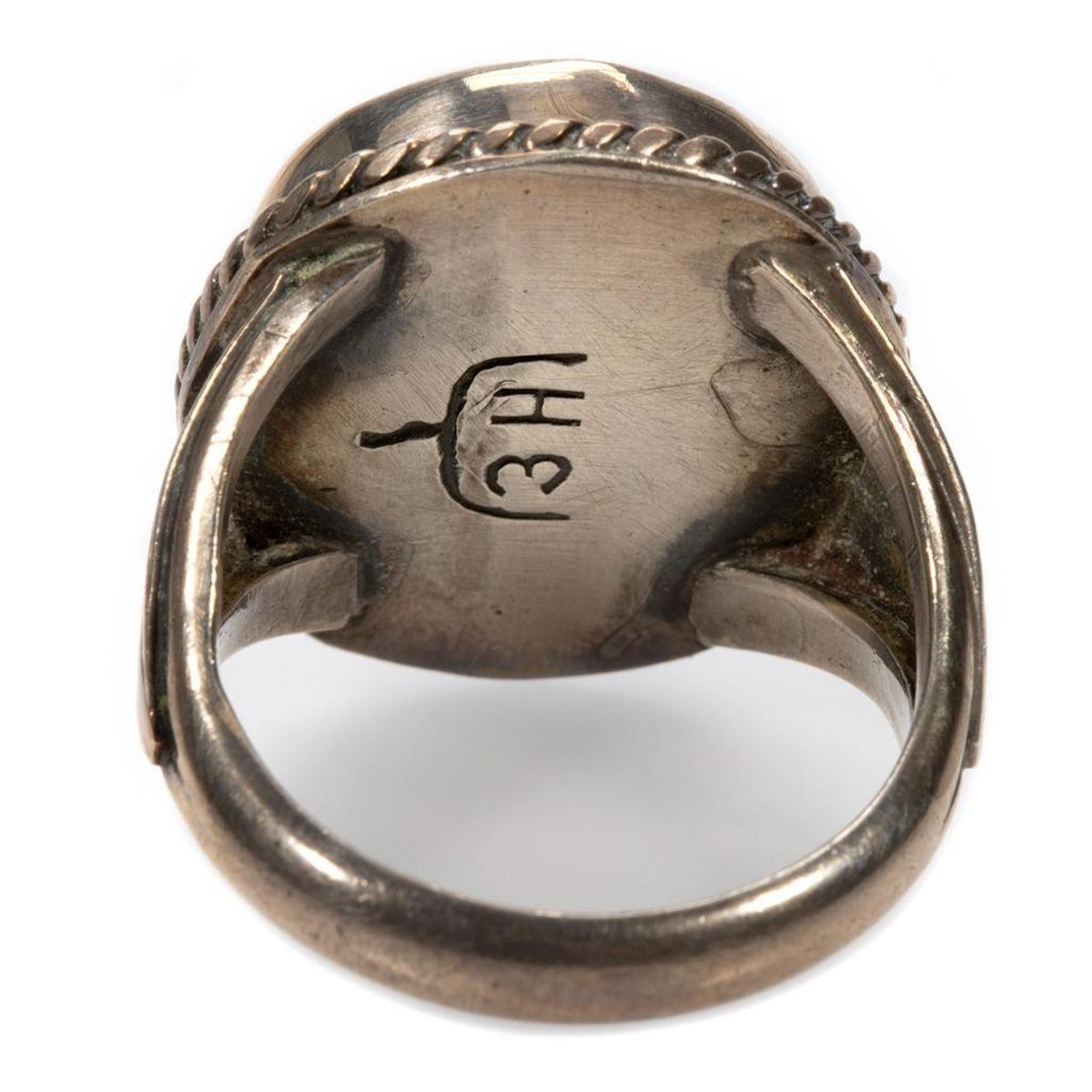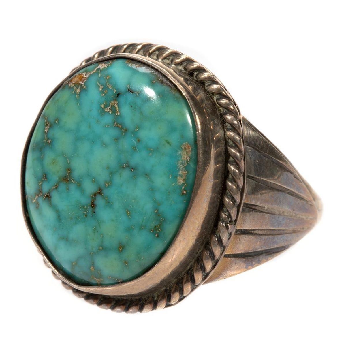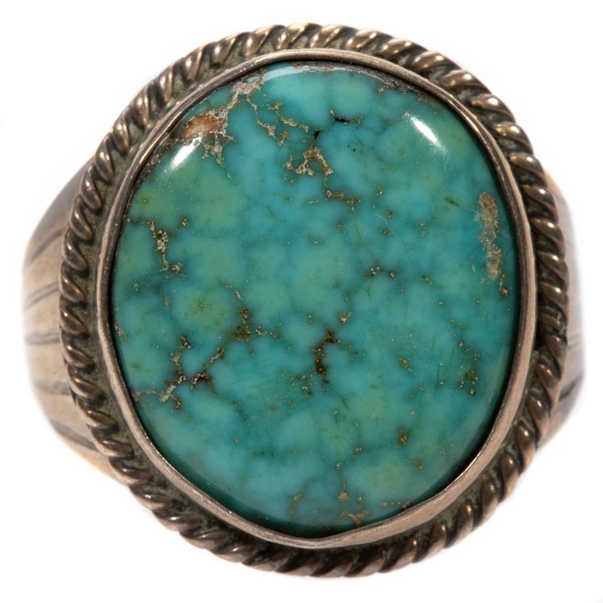bezel-set turquoise measuring approximately 20 x 18mm; stamped 3H; weighing 12 grams; size: 10 1/4