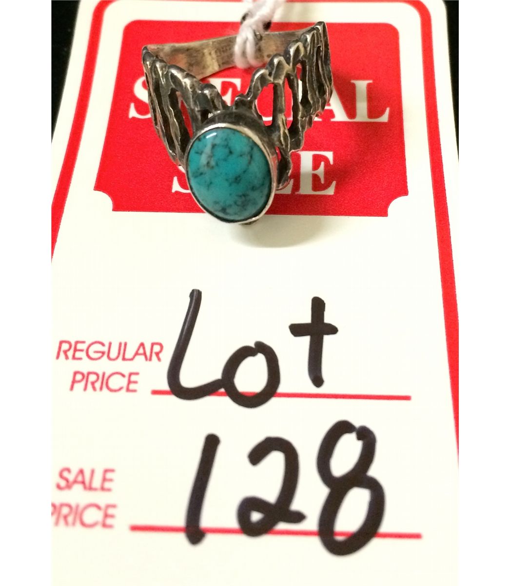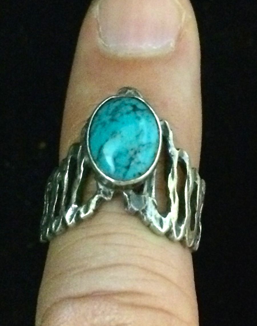 Size 6.5. This is a very unique turquoise and sterling silver ring. It has no makers Haulmark, but is marked as Sterling. It weighs 5.6 g.