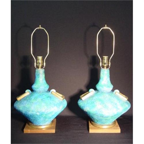 circa 1950 A pair of turquoise blue pottery table lamps resting on brass and square wood bases. Overall height 24" height to socket 17" diameter 12" square base 7"x7".