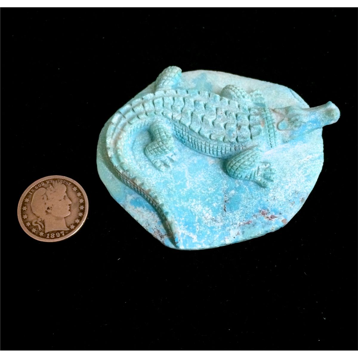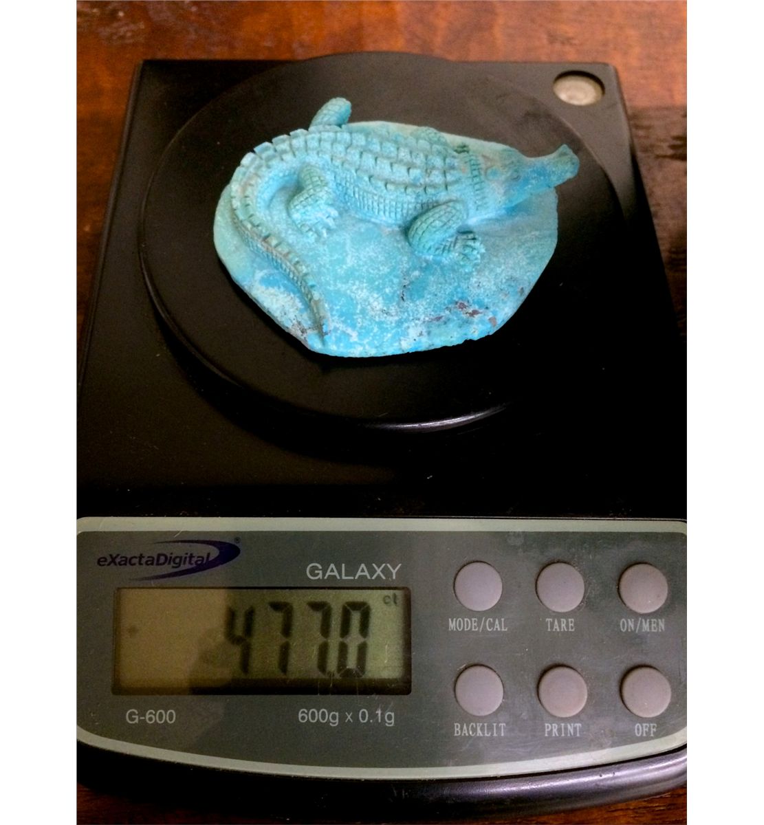 This piece of carved Turquoise weighs 477 carats and is carved in the form of an alligator. It is not known from which mine this Turquoise originated.