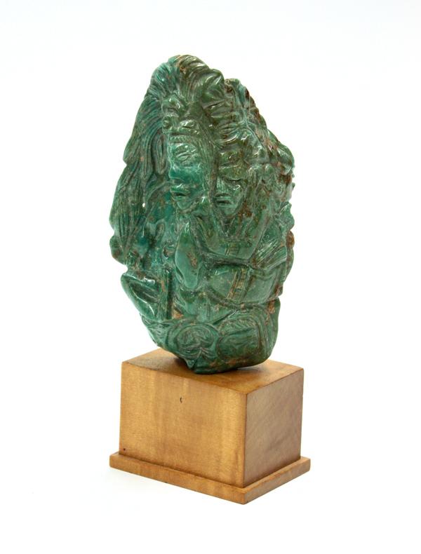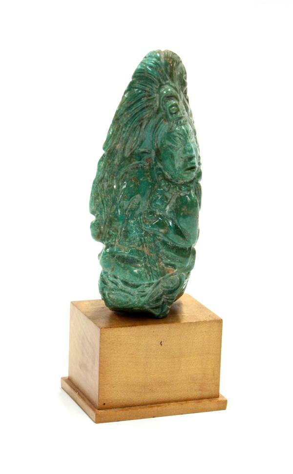 Turquoise figural sculpture, Latin American, the organic natural free form having a carved body depicting faces and figures in the round and rising on a rectangular plinth, 7''h