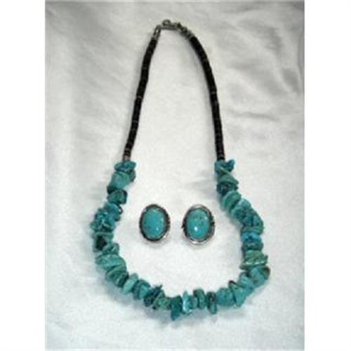These were purchased from a roadside stand in Arizona and are gorgeous. The Turquoise chips are much larger than usual. About 1/2" length. The necklace itself is approximately 21 inches long. With the necklace are two oval shaped earrings. They are an 1 inch in length. Amazingly the turquoise in the necklace and in the earrings are an excellent match! They are more green than than the pictures imply.