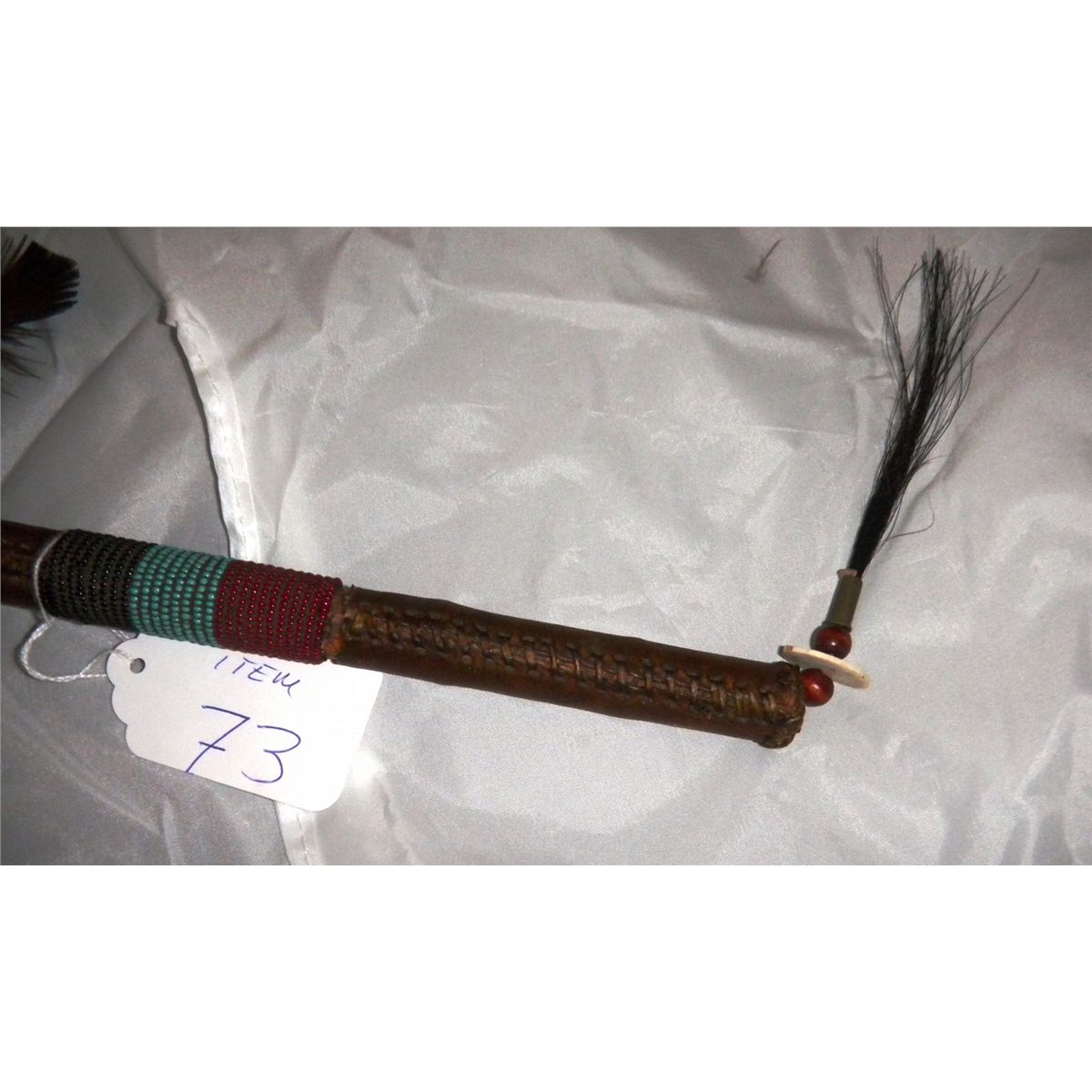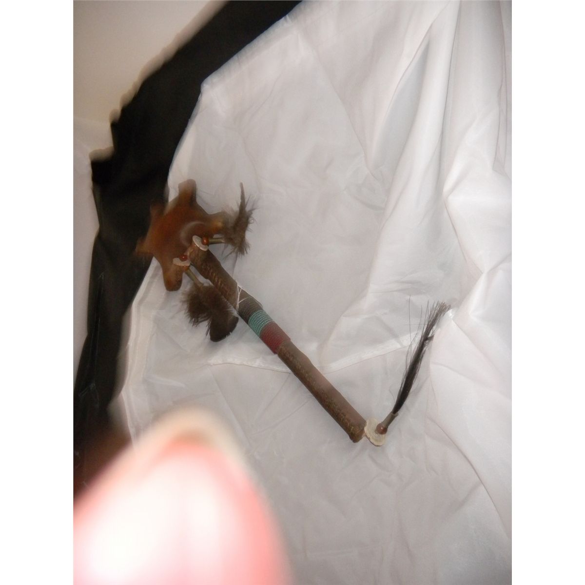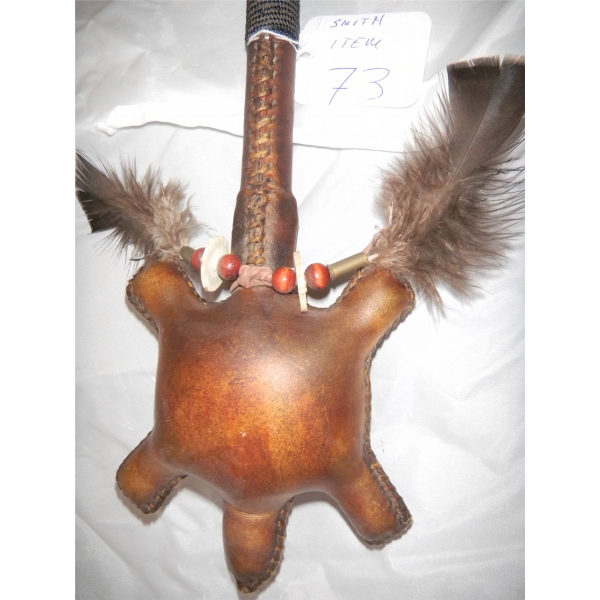 Turtle Effigy Rattle - Plains Beaded Raw hide - Feathers horse hair with antler beads 16"x5"x2 1/2" Shipping $12.50