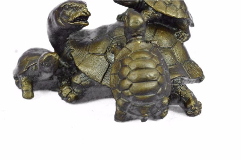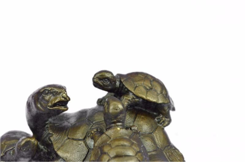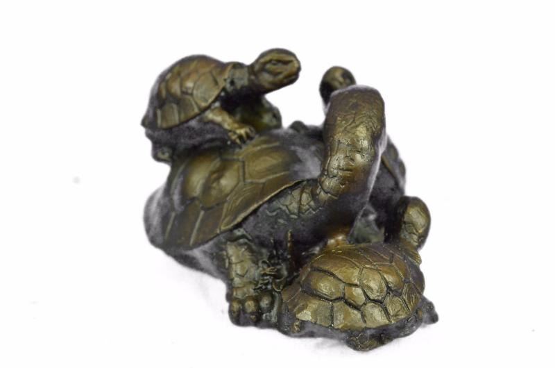 The mother turtle can be seen here with three of her offspring along a marshy bed of a lake. Before they venture off into the wilderness to start their lives, they all crowd around, climbing about her hard shell saying their last goodbyes. Animal symbolism of the turtle in order, creation, patience, strength, stability, longevity, innocence, endurance, and protection. The bronze sculpture was captured using the age-old method of lost-wax casting and stained with a brown patina finish for preservation and mounted upon a marble base. Dimensions: Height 2 X Width 4 inches. Weight: 1 LB.