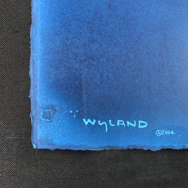 "Turtle Reef Kiss" is an original watercolor painting on deckle-edge paper by Wyland, hand signed by the artist and with Certificate of Authenticity. The frame is imperfect with moderate wear. Measures approximately 33" x 40" (framed), 23" x 30 (image).