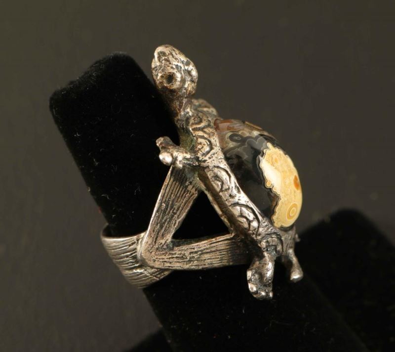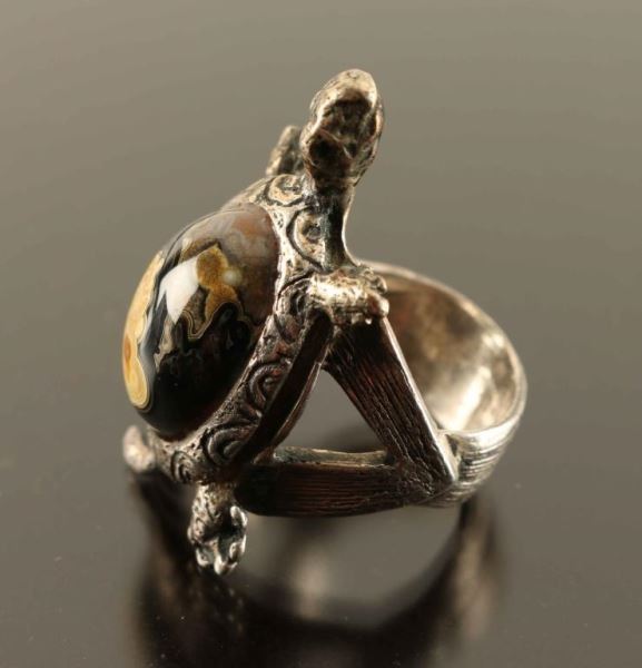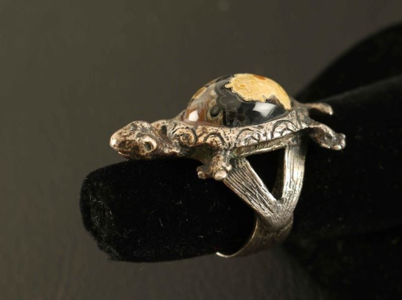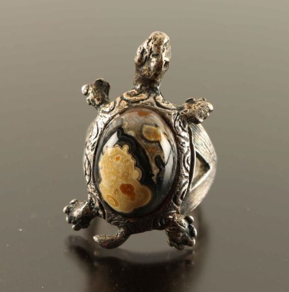 Sterling silver turtle with etched detail and interesting stone shell. 1 3/8" long, size 6.