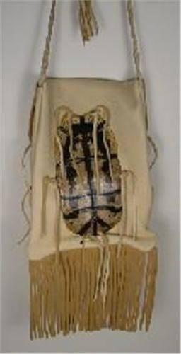 These bags are made using a red ear turtle and deerskin leather. The 32" deerskin strap is braided. The turtle shell has been split, with the back incorporated into the back of the bag.