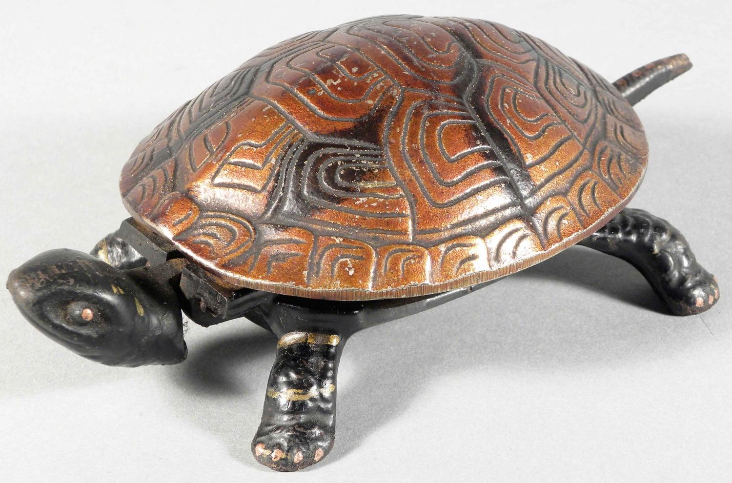 Figural Store Bell. In the shape of turtle. Cast iron with copper flash finish. Push head down to activate bell. Excellent working condition. 3 1/2 X 2 1/2 X 7 inches. Starting bid $100