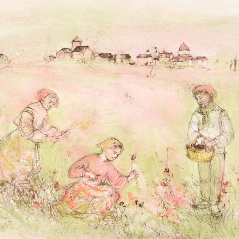 "Tuscan Fields" is a limited edition lithograph on rice paper by Edna Hibel (1917-2014) numbered and hand signed by the artist. Includes Certificate of Authenticity. Measures approx. 35.5" x 24.5" (border) 28" x 18" (image).
