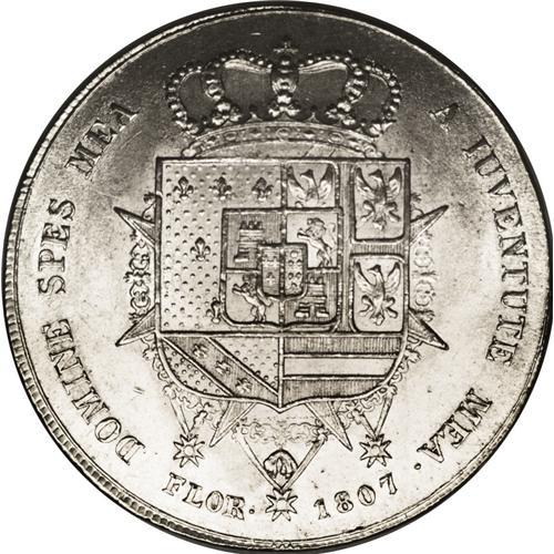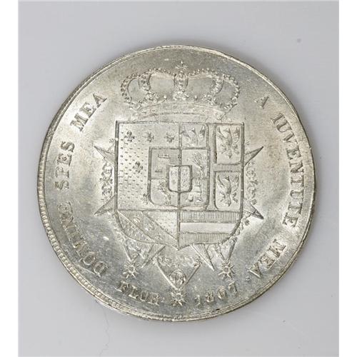 <B>Tuscany. Charles and Maria Louisa 10 Lire 1807, </B></I>KM-C49.2, legend with FLOR, choice AU-UNC, fully lustrous and very attractive. One faint adjustment mark on the obverse.<BR><I>From the Blue Ridge Collection</B></I><BR><BR><b>Shipping:</b> Coin/Currency (<a target="_blank" href="http://www.heritageauctions.com/common/shipping.php">view shipping information</a>)