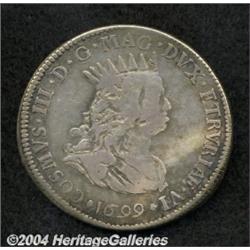 <B>Tuscany. Cosimo III 1 Piastre 1699,</B></I> Bust of Cosmos III/Ship in Harbor, KM16.4, Dav-4215, Fine. <BR><BR><B>Important notice:</B> Heritage usually auctions material at the rate of 200-250 lots per hour. On some occasions eBay Live bid software or the Internet may not be able to keep up with the pace of the auction. We recommend placing a realistic absentee bid now as insurance to avoid disappointment. Occasionally the auctioneer may eliminate or reject an eBay Live bid, and the auctioneer may also reopen a lot after the close of the eBay live bidding (usually because we missed an audience bid), and may reject your bid even if it shows you as the winning bidder. By bidding via eBay Live, you agree that Heritage may award the lot to another bidder at its sole discretion under the circumstances described above or any other reasonable circumstances. Since eBay bids are not shown to us until we open the lot on the floor, we treat those bids just like floor bids. In most cases the floor responds before the eBay bid is presented to us, due to Internet lag time, so for consistency we have made it a policy that floor bids are always considered first over tie eBay live bids. Also please note that all Heritage lots purchased through eBay Live carry a 20% Buyer's Premium. Please make sure you read the Terms and Conditions before you bid.