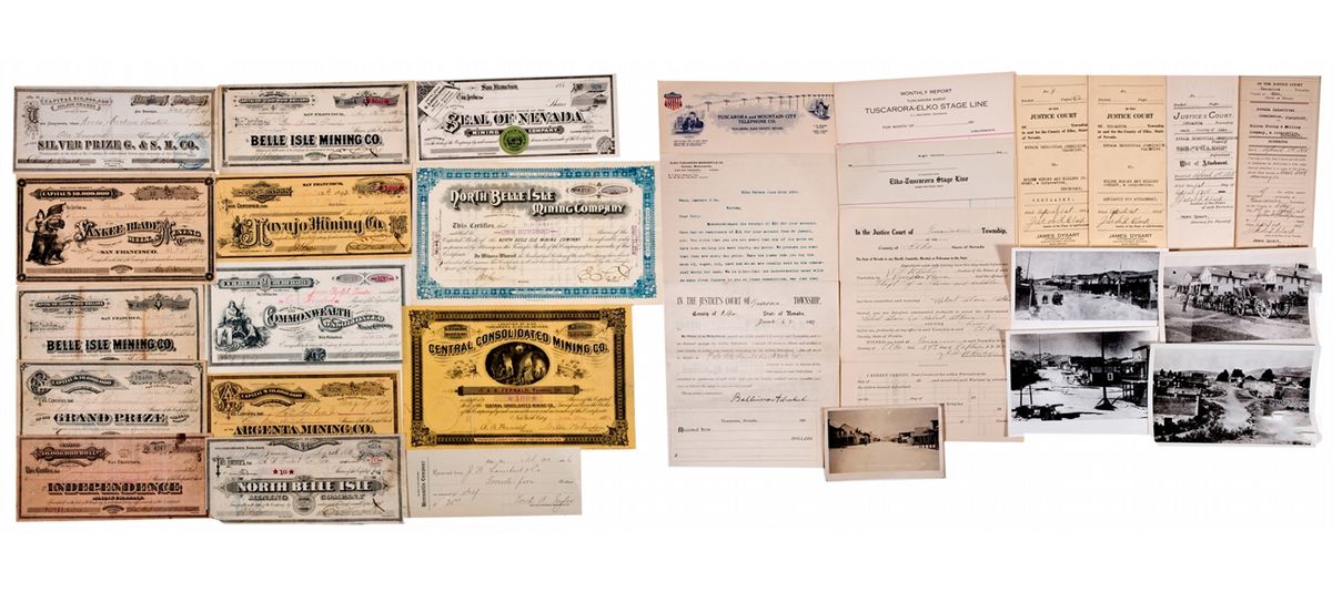 c1877 An album containing 13 stock certificates, 6 Justice Court documents; 4 5" x 7” black/white photos; 2 stage-line billheads and one receipt; and 2 letterheads, one with receipt and one with accompanying 1908 photo postcard. The stock certificates are from the following companies: Silver Prize G. & S. M. Co. (1877); Yankee Blade Mill & Mining Co. (1877); Argenta Mining Co. (1887); Seal of Nevada MC, (188x); 2 North Belle Isle MC (1888 & 1892); 2 Belle Isle MC certificates (1879 & 1892); Grand Prize MC (1882); Navajo MC, (1893); Commonwealth Consolidated MC (1898); Independence MC (1879); and Central Consolidated MC (1883). The Justice Court documents include a 1918 arrest certificate for a horse thief, a Writ of Attachment dated 1913, and 4 court documents relating to a complaint brought by the Nevada Industrial Commission against Holden Mining & Milling Company in 1918. The 4 photos include various views of Tuscarora’s main street, one with snow on the ground. The billheads are from the Tuscarora-Elko Stage Line. One is actually a monthly report form and the other a billhead and both are unused, as is the accompanying receipt form datelined Tuscarora. One letterhead is for the Tuscarora and Mountain City Telephone Company, is unused, and is accompanied by a real photo post card of Tuscarora’s main street; it is postmarked 1908. The final letter is addressed to Messrs. Lambert & Co. from the Elko-Tuscarora Mercantile Co., dated 1896 and the accompanying receipt is for the $25 mentioned in the letter. Tuscarora was named after a Civil war ship. Its most productive years were 1869 to 1890, when its silver mines were producing. It had a Chinatown, as Chinese railroad workers stayed on to placer mine. A fabulous collection in VF condition. - HKA#66324