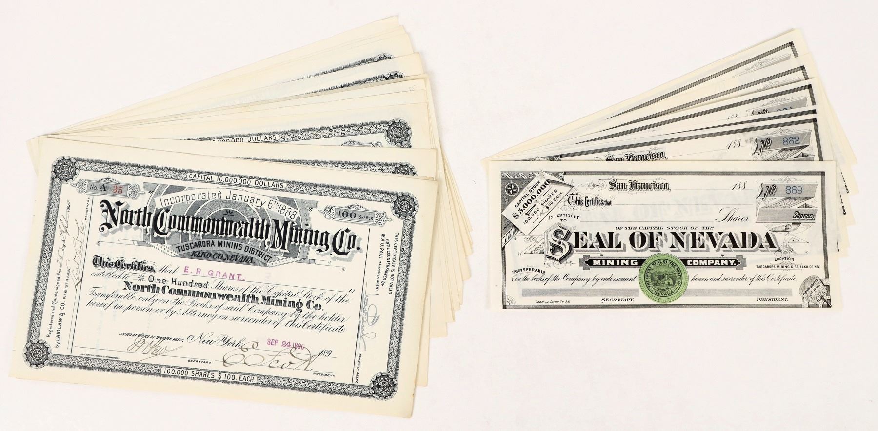 22 Tuscarora Mining Stocks, 2 Different c.1890 Seal of Nevada Mining Company unissued stocks (7) North Commonwealth Mining Co. issued 1890 (15)