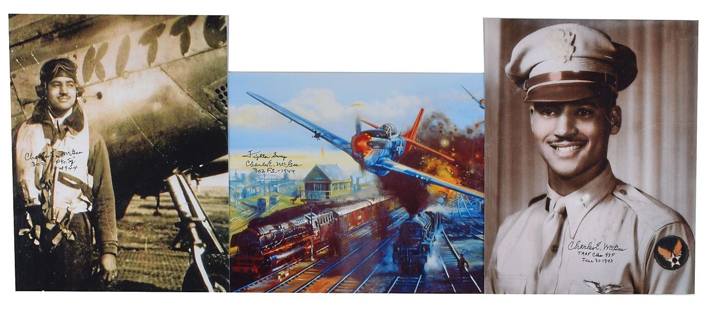 African-American fighter pilot (born 1919) who was one of the Tuskegee Airmen and a career officer in the United States Air Force for 30 years; he flew a total of 409 combat missions in World War II, Korea and Vietnam. Three glossy photos of famed Tuskegee airman Charles McGee: a color 8 x 10 portrait of McGee wearing his uniform, signed in thin black felt tip, "Charles E. McGee, TAAF Clan 43F, June 30 1943"; an 8 x 10 photo of McGee standing next to 'Kitten,' his P-51B 42-103968, nicknamed after his wife, signed in thin black felt tip by McGee, who adds: "302 Ptr. Sq., 1944"; and an image of a Robert Bailey painting entitled 'Tuskegee Junction,' signed in thin black felt tip by McGee, who adds: "Fighter Sweep…302 FS.—1944." In overall fine condition. Accompanied by a personal calling card belonging to McGee, who has signed in black ballpoint.