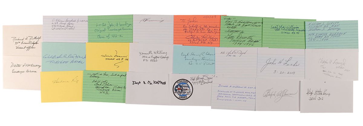 Ink and felt tip signatures of 23 Tuskegee Airmen on individual 5 x 3 cards, various colors, some lined. Signers are: Harvey Alexander, Jack Bryant, Herndon Cummings, Wilfred Defour, Gene Derricotte, O. Oliver Goodall, Noel Harris, Buford Johnson, Fred Johnson, Hal King, Utha Knox, Charles Lane, John Leahr, Walter McCreary, Lloyd McKeethen, John Mulzac, Harry Quinton, Richard Rutledge, William Surcey, Yenwith Whitney, Chas Williams, Donald Williams, and Eldridge Williams. In fine condition.