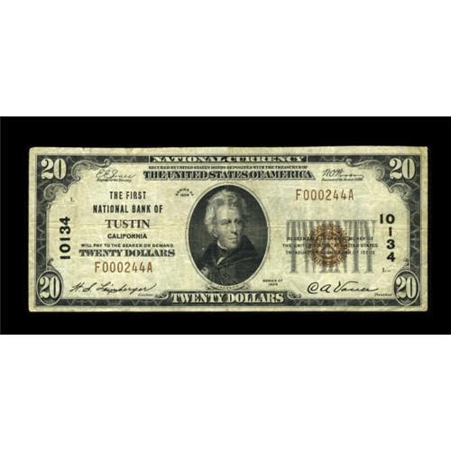 <B>Tustin, CA</B></I> - $20 1929 Ty. 1 <B>The First NB</B></I> Ch. # 10134<BR> A tougher note from the only issuer in this Orange County community. The Horwedel collection example graded only Fine and realized $1380. This specimen is nicer and will likely realize a bit more. <B>Very Fine.</B></I><BR><I>From The Kansas City Collection.</B></I><BR><BR><b>Shipping:</b> Coins & Currency (<a target="_blank" href="http://www.heritageauctions.com/common/shipping.php">view shipping information</a>)