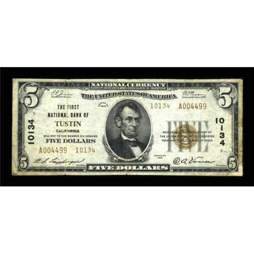 <B>Tustin, CA</B></I> - $5 1929 Ty. 2 <B>The First NB</B></I> Ch. # 10134<BR> A pleasing <B>Fine-Very Fine</B></I> example from this sought after Orange County bank.<BR><BR><b>Shipping:</b> Coins & Currency (<a target="_blank" href="http://www.heritageauctions.com/common/shipping.php">view shipping information</a>)