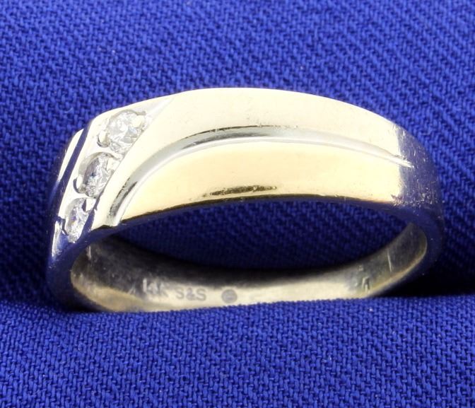 There are 3 brilliant cut diamonds that weight a total of 0.18 carats. Clarity SI2-I1, Color G-H. The width is 7mm and tapers to 4mm. Size 9.5 6.6g