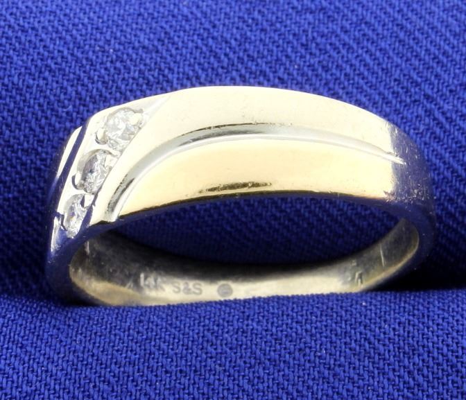 There are 3 brilliant cut diamonds that weight a total of 0.18 carats. Clarity SI2-I1, Color G-H. The width is 7mm and tapers to 4mm. Size 9.5 6.6g
