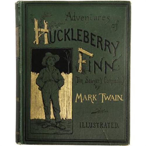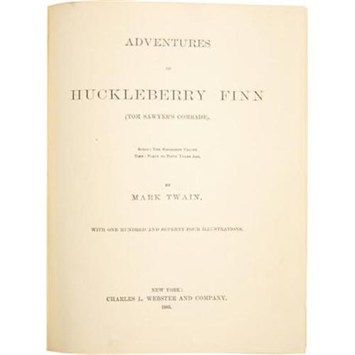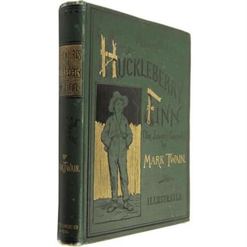 <B>Mark Twain. E.W. Kemble [illustrator].</B></I><B><I> Adventures of Huckleberry Finn (Tom Sawyer's Comrade).</B></I></B></I> With one hundred and seventy-four illustrations. New York: Charles L. Webster and Company, 1885.<BR><BR>First American edition, first issue, with the following points: the title-page is a cancel, with the copyright notice dated 1884 (BAL second state, with the first state only noted in publisher's prospectuses and advanced sheets); p. [13], the illustration captioned "Him and another Man" is incorrectly listed as at p. 88 (BAL first state); p. 57, the eleventh line from the bottom reads "with the was" instead of "with the saw" (BAL first state); p. 155, the final "5" is lacking in the pagination (BAL first or second state); the final leaf (238) is present as a blank leaf; and the frontispiece portrait has the imprint of the Heliotype Printing Co., the tablecloth, or scarf, is clearly visible (BAL first state). Octavo. 366, [2, blank] pp. Inserted frontispiece portrait and wood-engraved text illustrations.<BR><BR>In the publisher's full pictorial green-cloth binding, stamped and lettered in gilt and black. Bumping and wear around the edges, with some loss at the foot of the spine and some corners. Front hinge cracked and in need of repair. Some soiling to preliminary pages, else a very good copy.<BR><BR>BAL 3415.<BR><BR><b>Shipping:</b> Books & Catalogs (<a target="_blank" href="http://www.heritageauctions.com/common/shipping.php">view shipping information</a>)