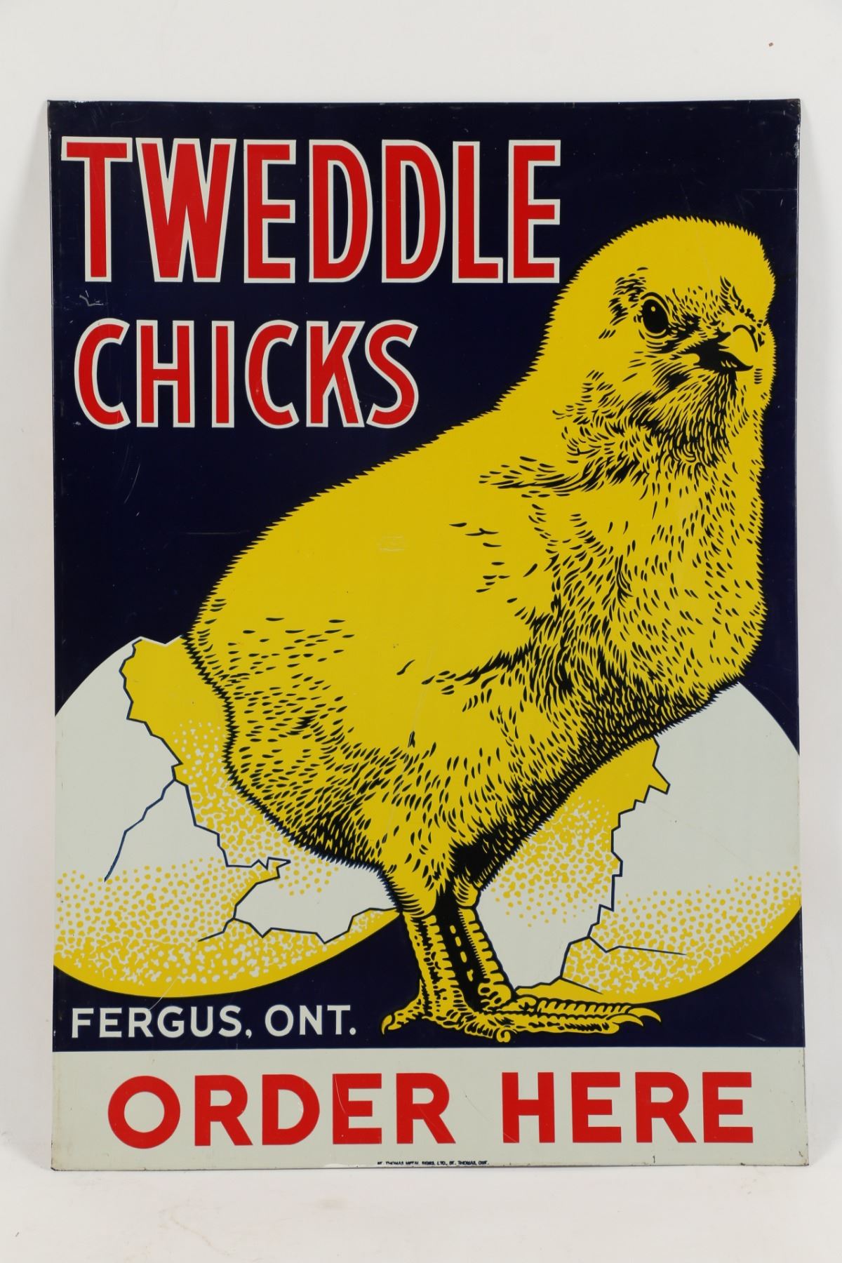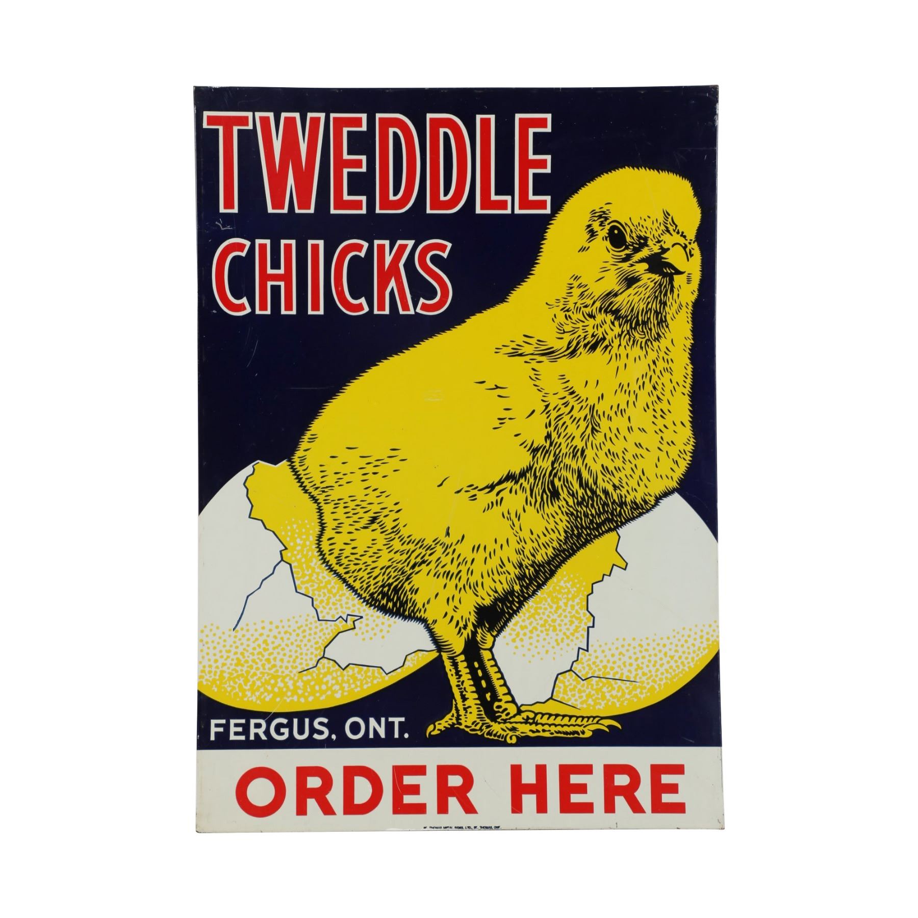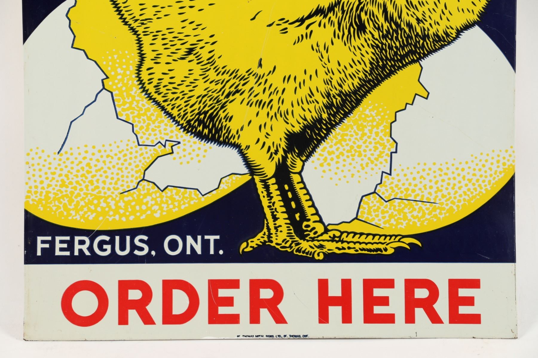 Canadian. Circa 1940. Fergus, Ontario. 2 unique sides. Features both chick and rooster graphics. Signed, "St. Thomas Metal Signs". 27.25" x 19.25". Exceptional colour and condition. $400-600.