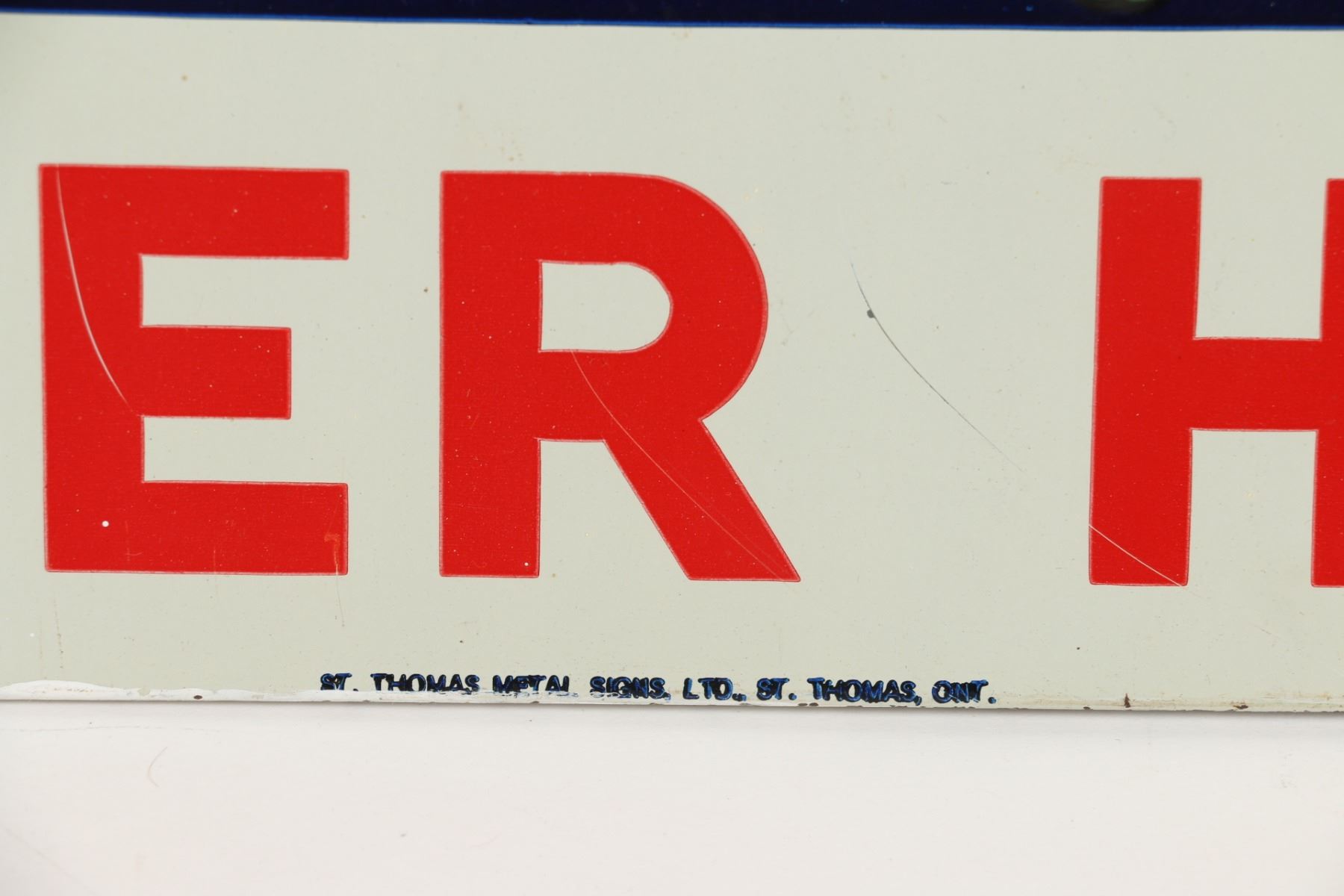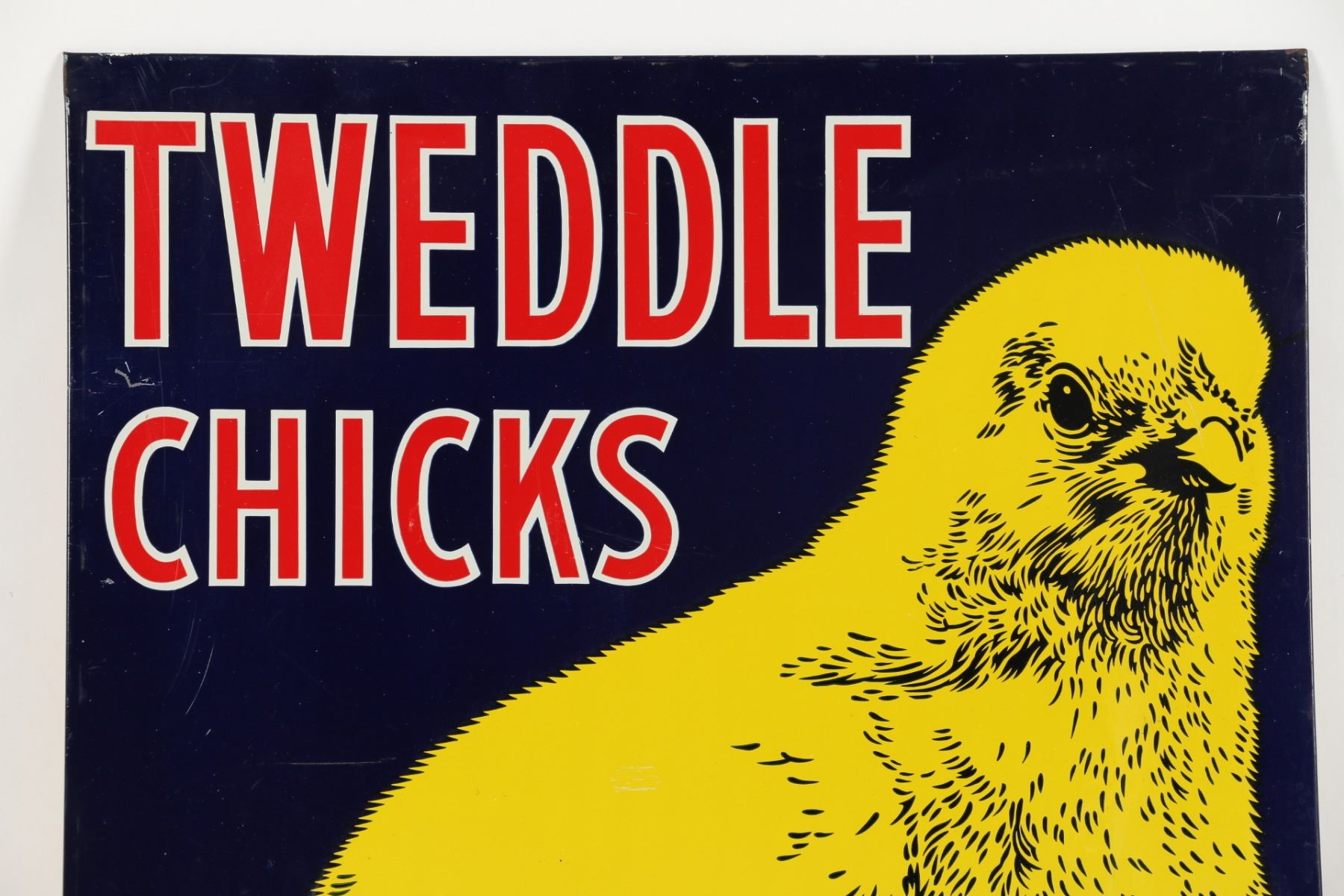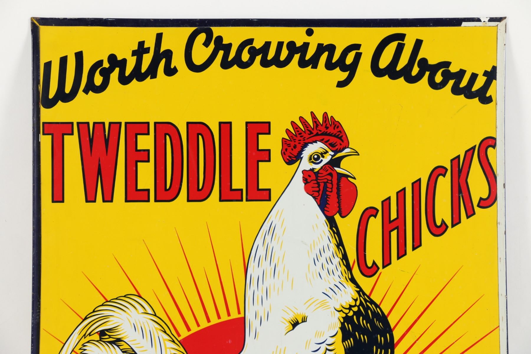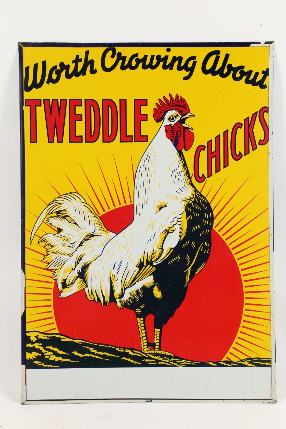 Canadian. Circa 1940. Fergus, Ontario. 2 unique sides. Features both chick and rooster graphics. Signed, "St. Thomas Metal Signs". 27.25" x 19.25". Exceptional colour and condition. $400-600.