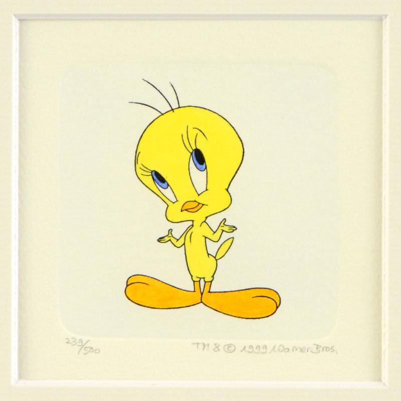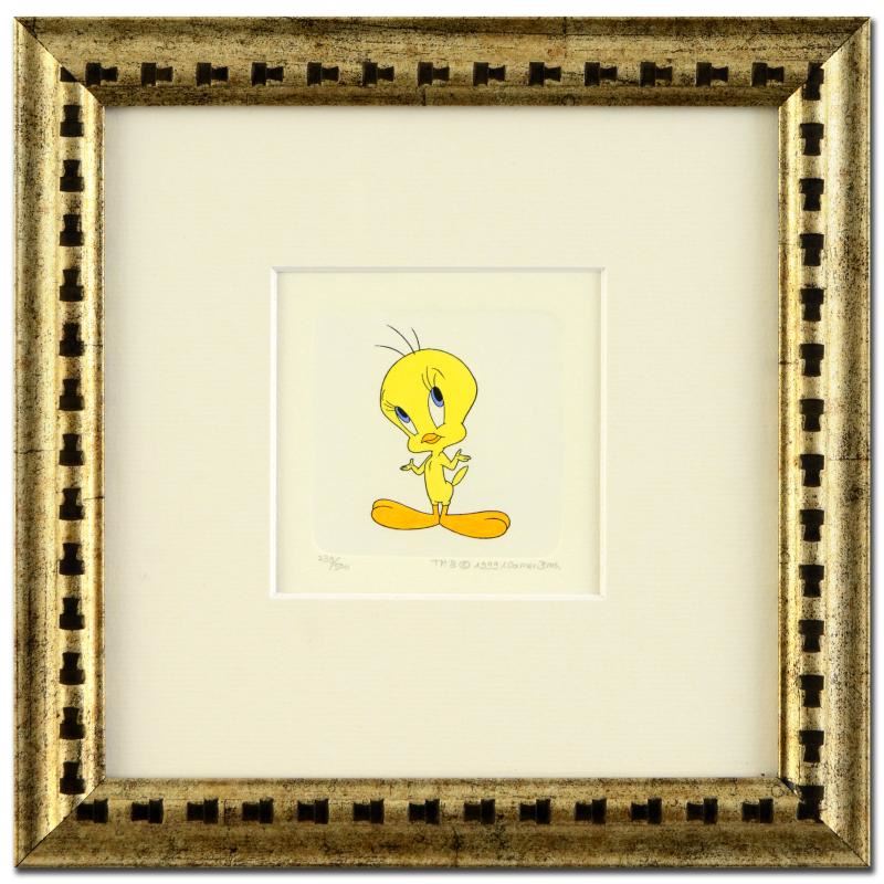 "Tweety (Arms to the Side)" is a limited edition etching on paper with hand-tinted coloring from Warner Bros. (dated 1999) and numbered! This piece comes framed. Measures approx. 9" x 9" (with frame), 1.5" x 2" (image).