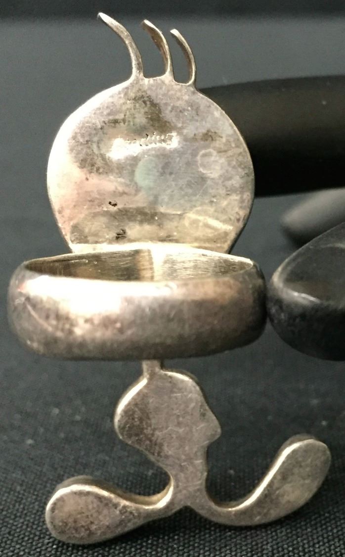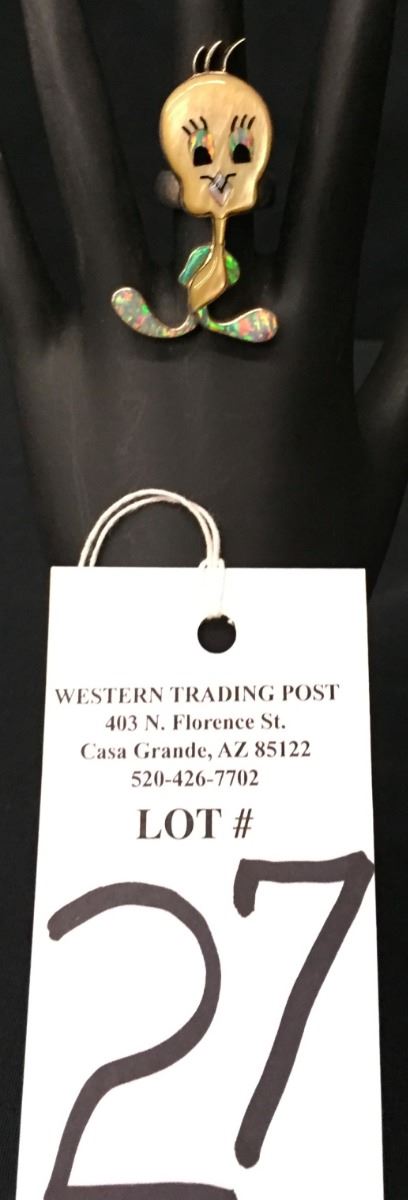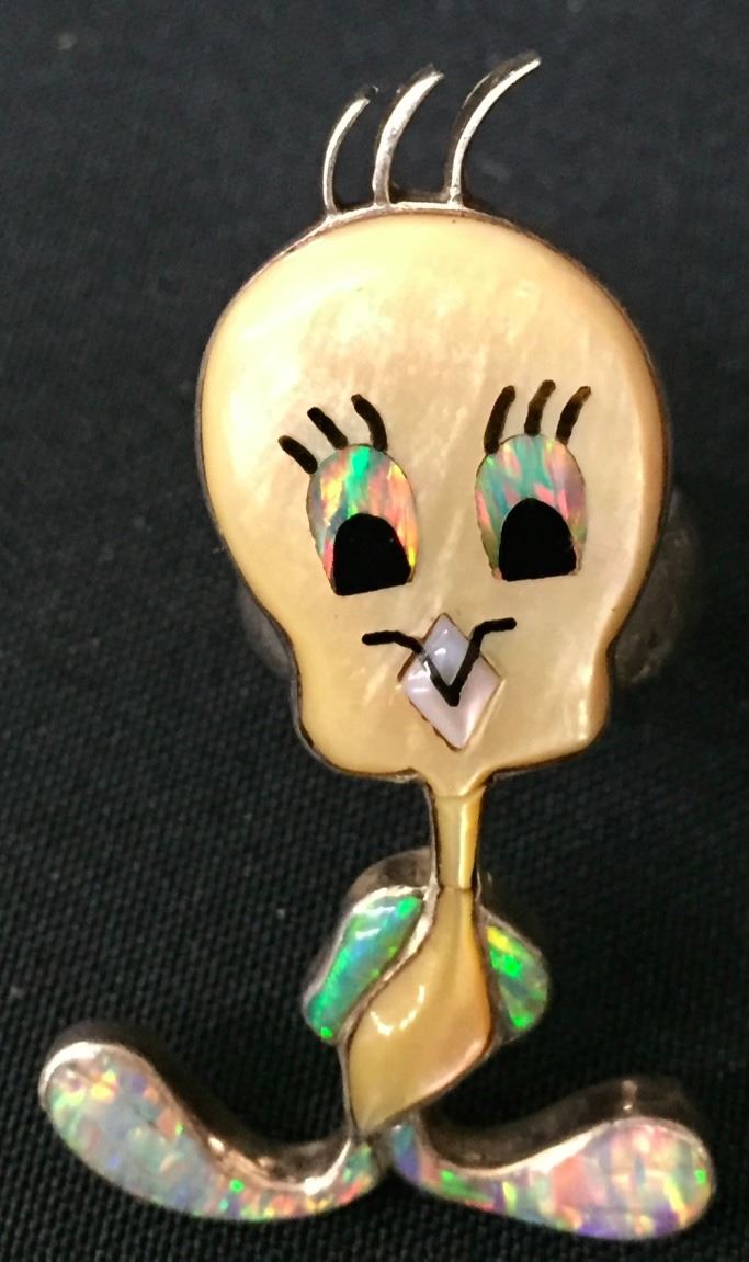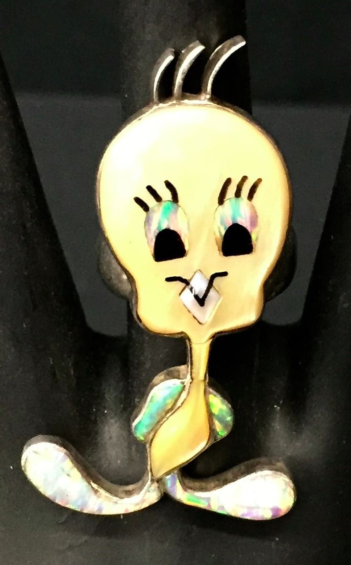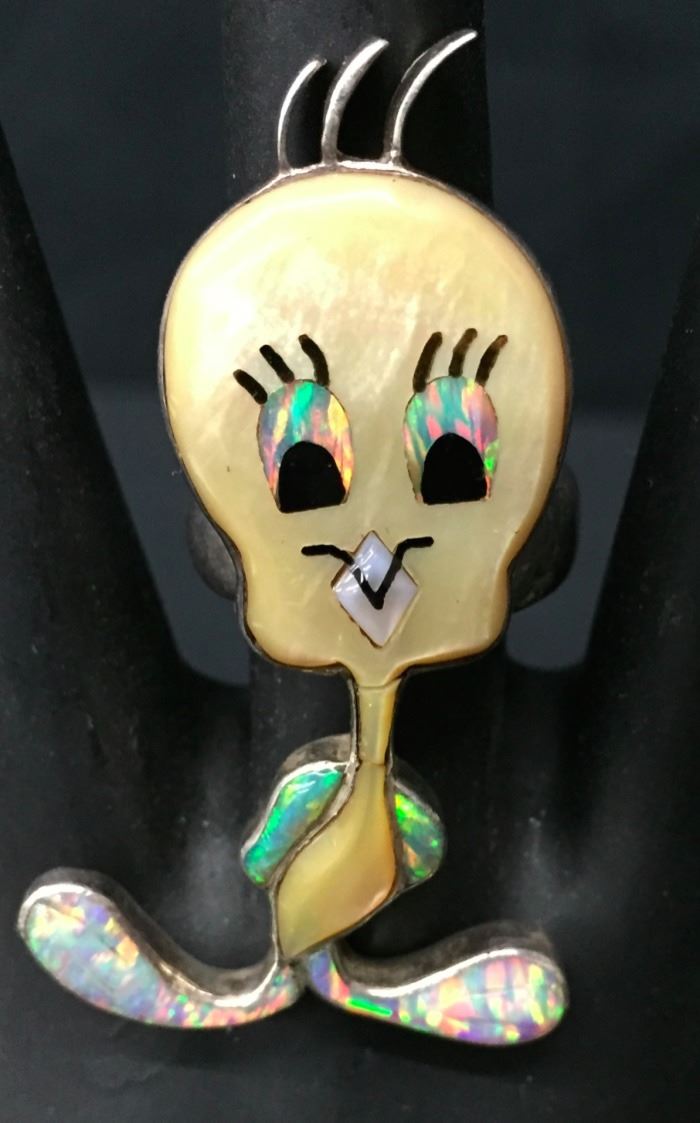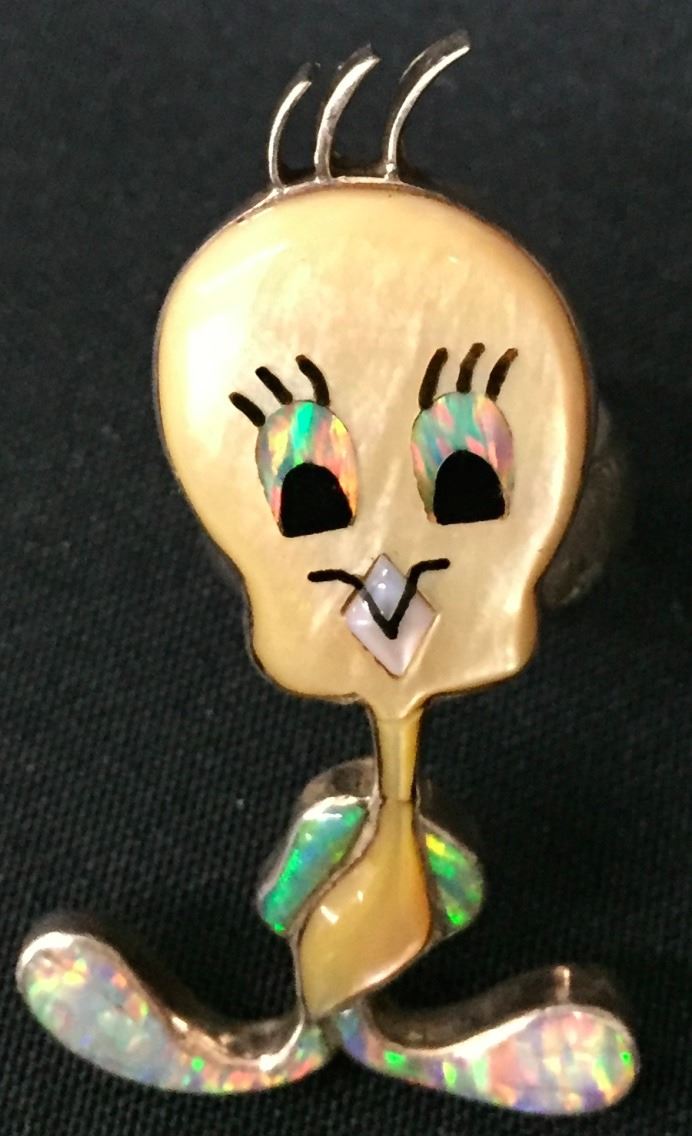 This vintage, Zuni style, “Tweety Bird” inlay ring is set in sterling silver. There is no makers hallmark. It is a size 7.5 and weighs 11.5 g. Good condition. Please look closely at the pics as they are an important part of our description. Shipping: There will be a $5 handling / packaging fee for shipping this lot. The actual cost of postage will be added on top of that.