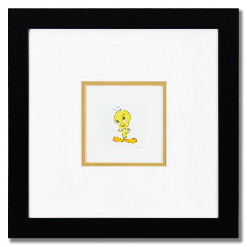 Tweety Bird is a limited edition etching on paper with hand-tinted coloring from Warner Bros, numbered and dated 1999. This piece comes framed. Measures approximately 14 x 14 (frame), 2.5 x 2.5 (image).